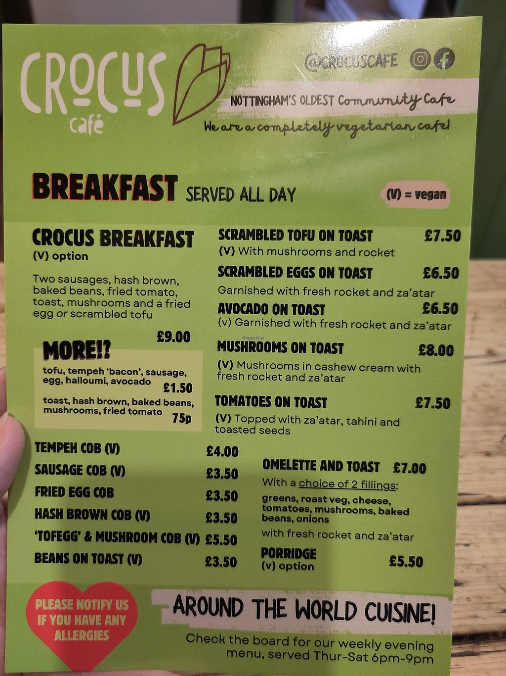 Have been going to the Crocus since I was a student many moons ago! The menu is great and the vegan breakfast is really good - so good, I have the same every time haha! Love that it's also a community cafe and do the pass one on scheme too.