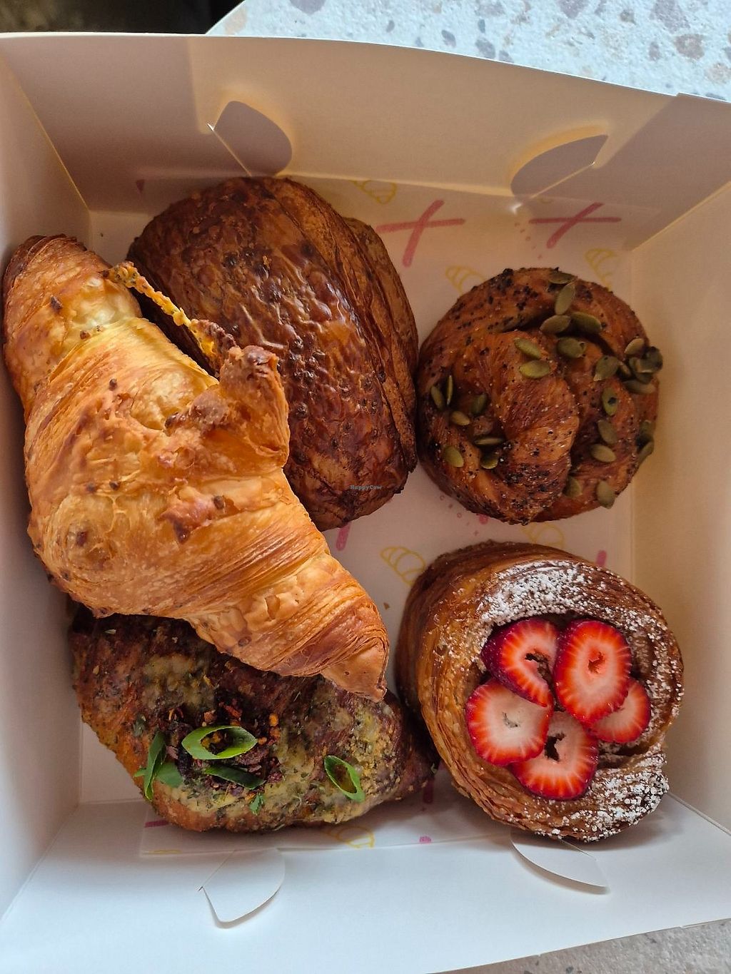 Strawberry+cream croissant $9.00: soft not flaky, bit too much strawbe…