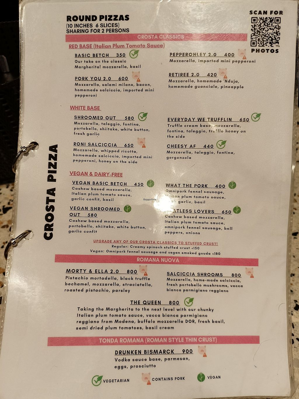 Full list of vegan menu options