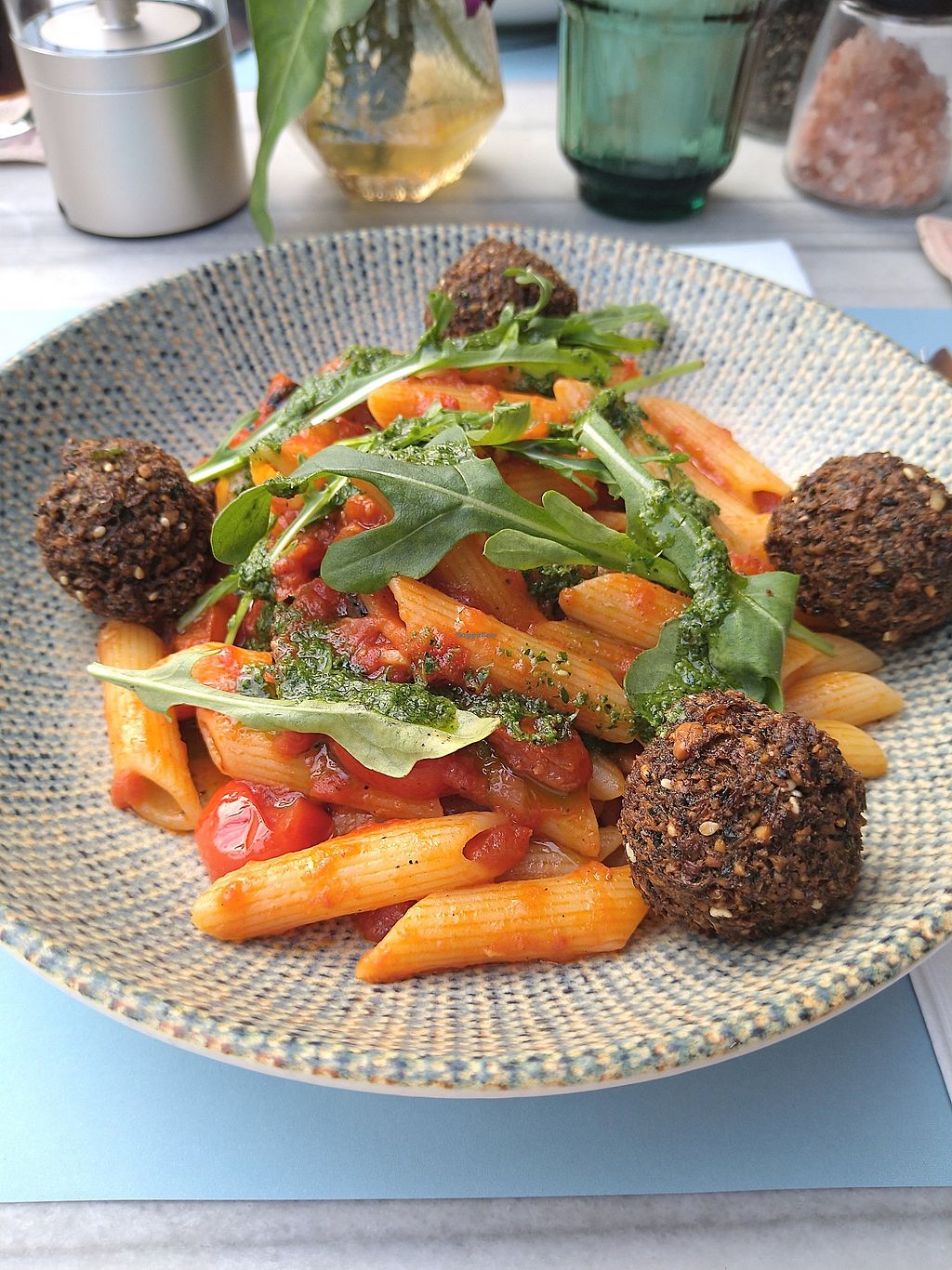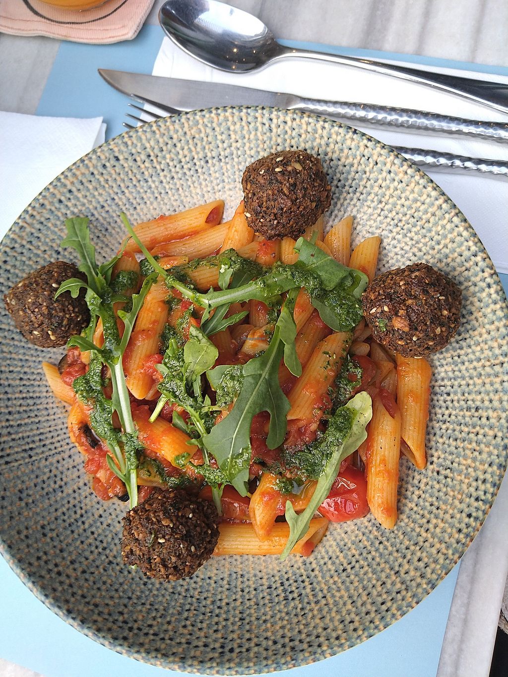 Pomodoro with vegan penne pasta with falafels and pesto. Very deliciou…
