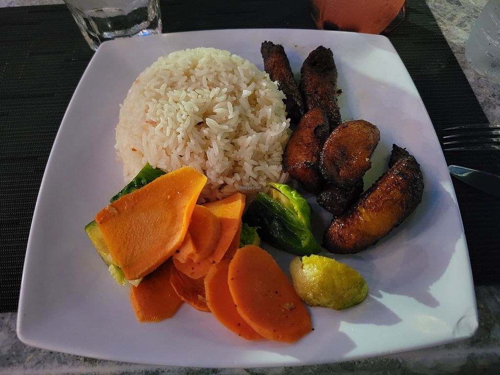 I was planning on getting the roti, but they were out. Instead, I got three side dishes: coconut rice, veggies, and plantains. It was all very tasty. The service was fine, and they also had a very talented live band playing bossa nova music.