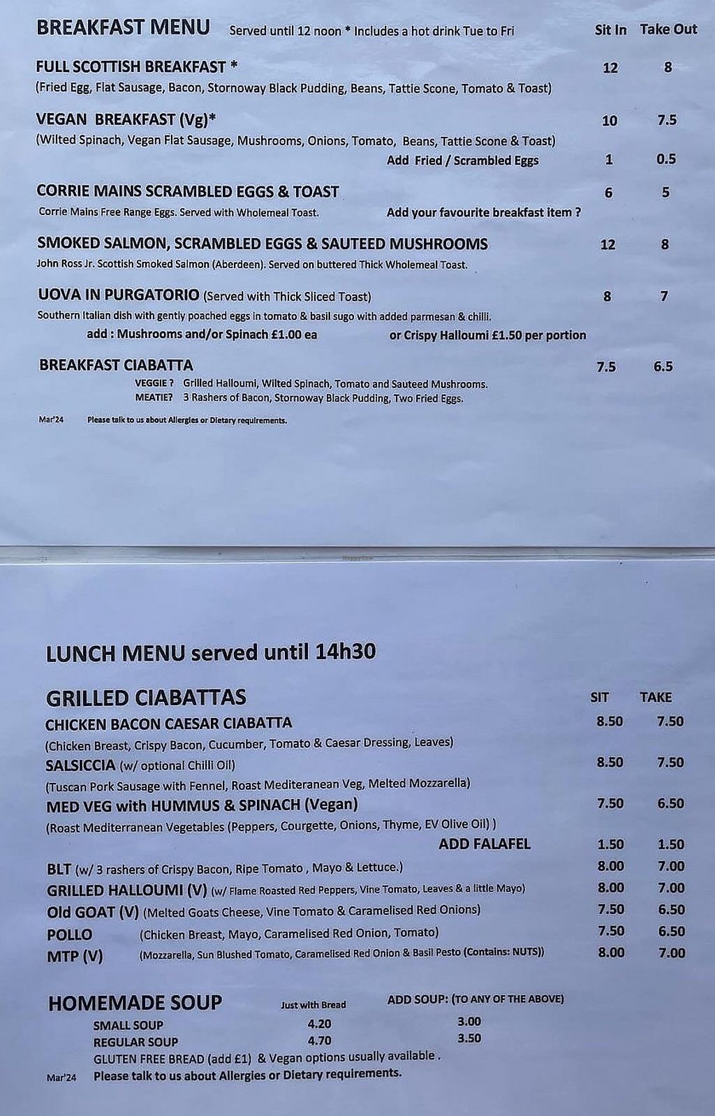 The name has changed they offer a breakfast vegan sausage , sandwich and other options great coffee clearly marked vegan options in small free trade village of loch winnoch lovely spot for coffee and breakfast