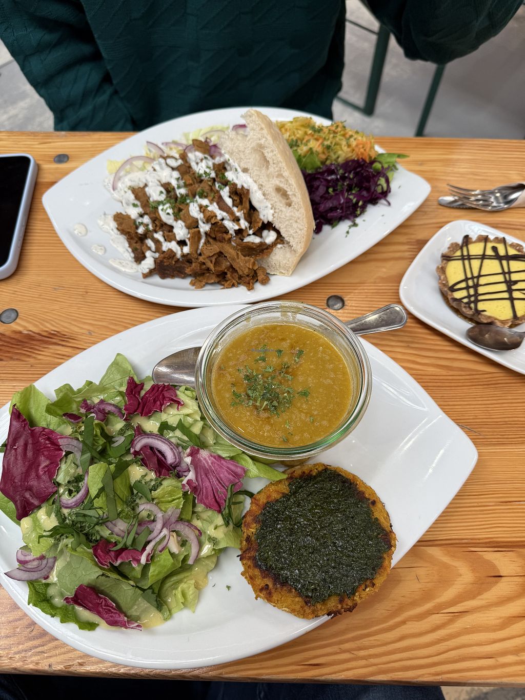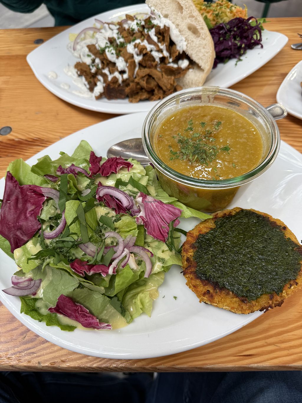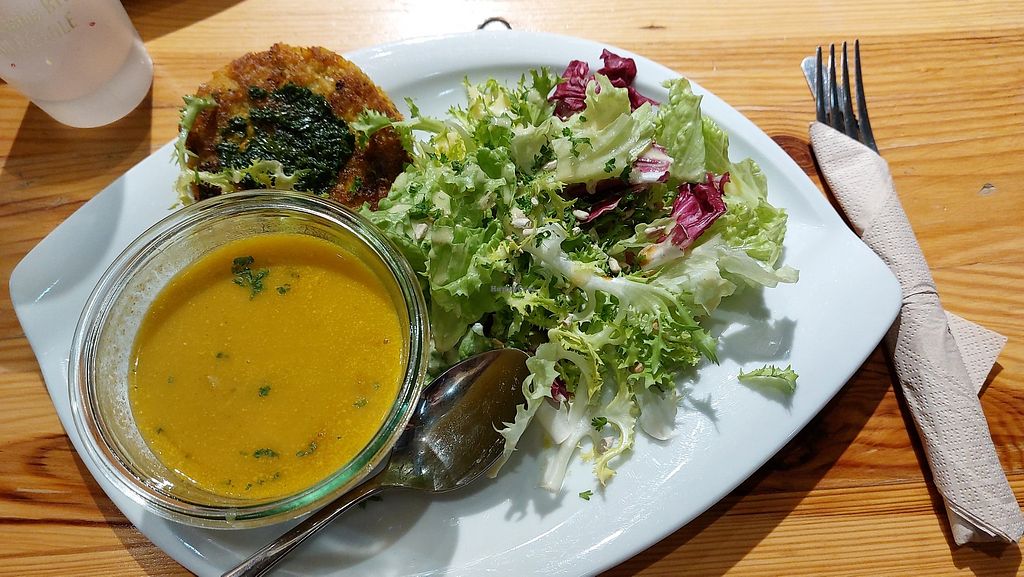 Combo menu of salad, soup, and vegetable rosti (in the shadow).