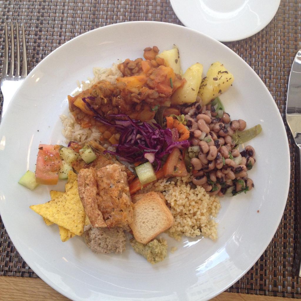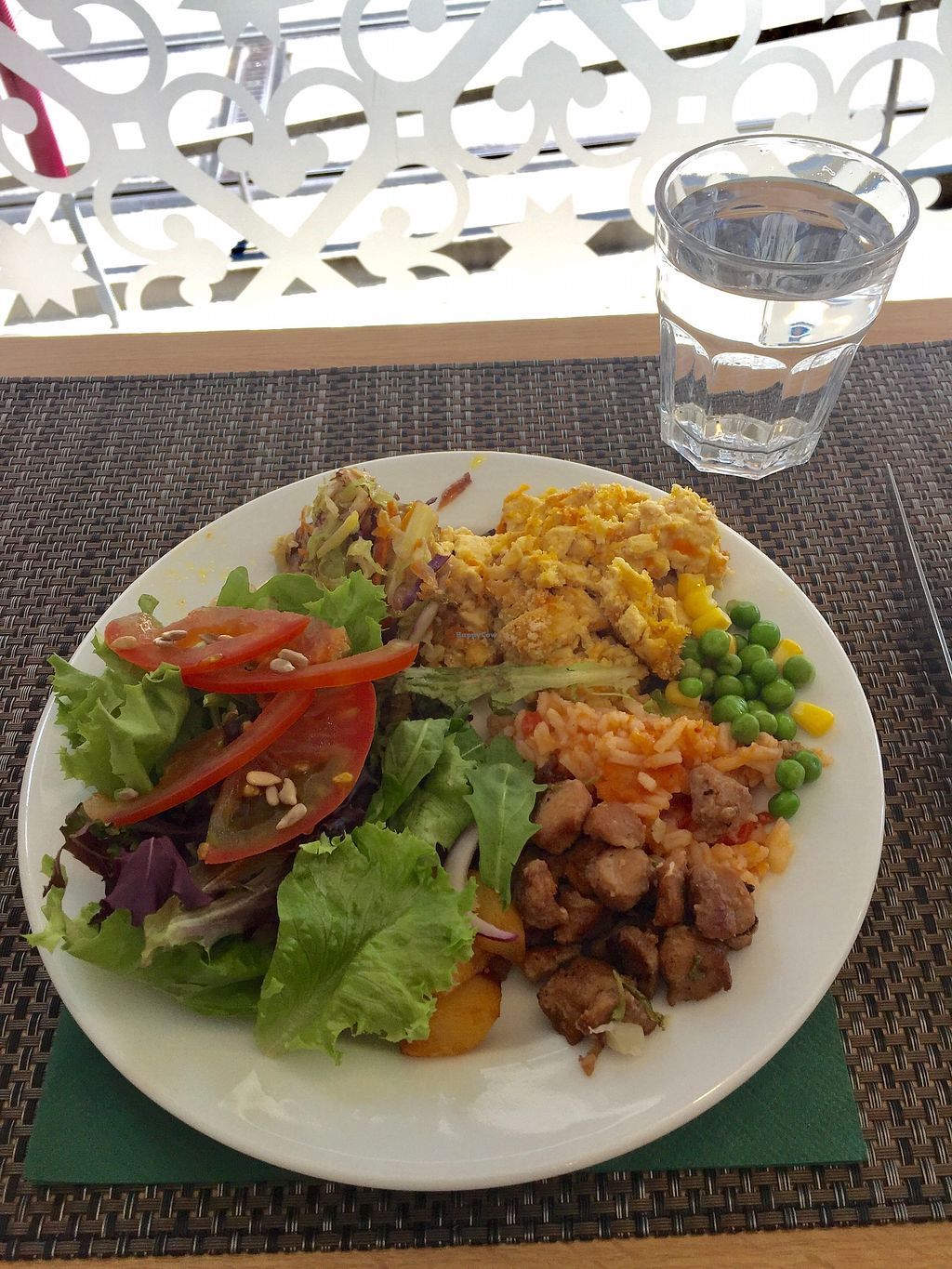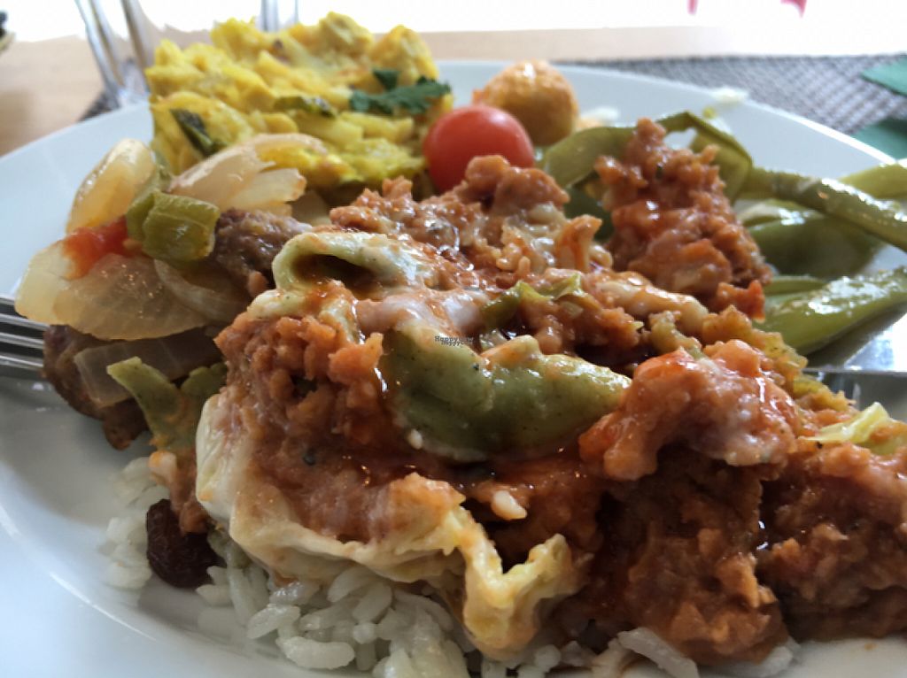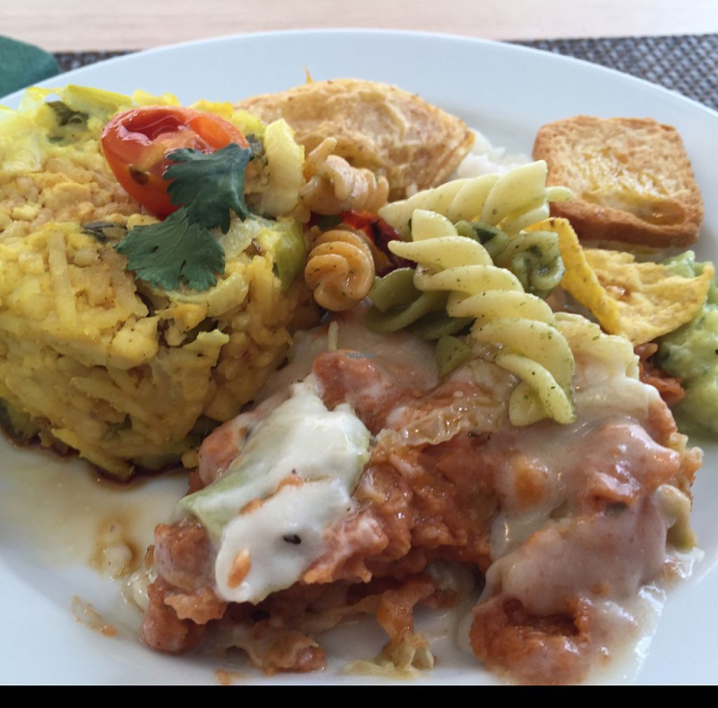 Spiritual tofu, soya bites, roasted mixed veg, salad, tomato rice, pea…