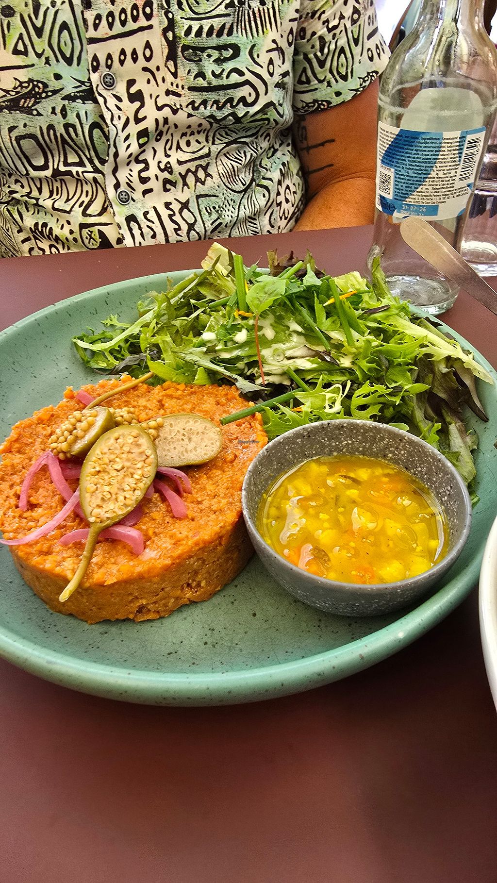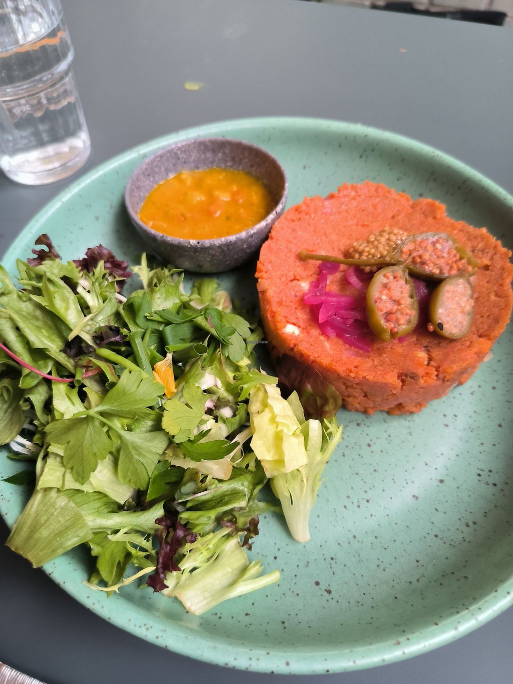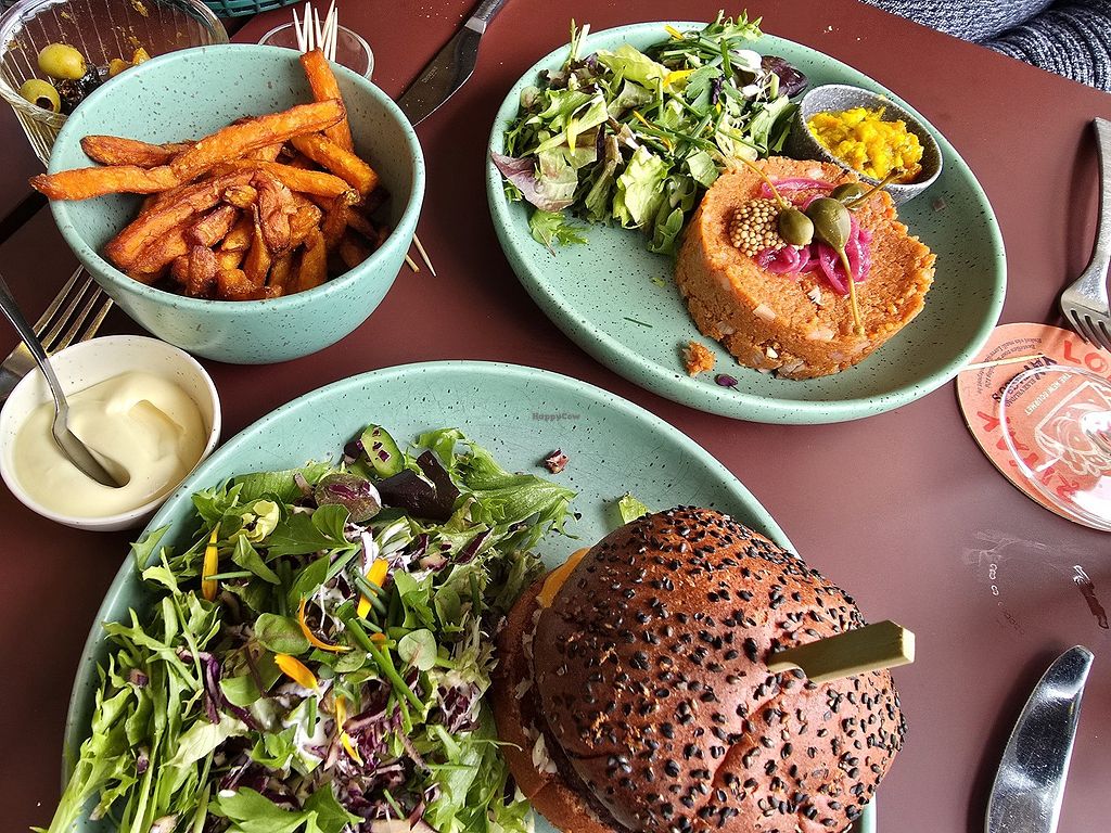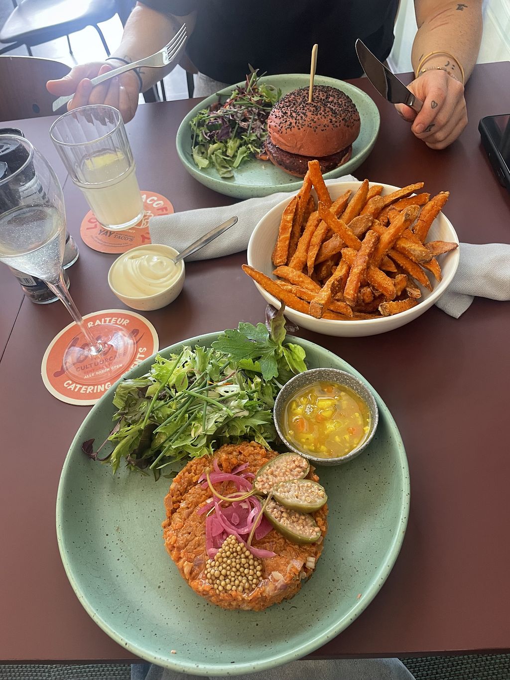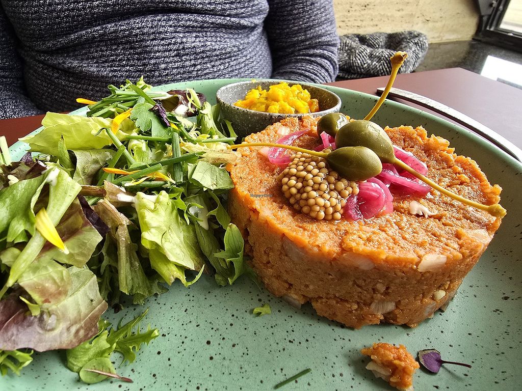Vegan tartaar met zoete aardappel frietjes (veganaise) en een vegan bi…