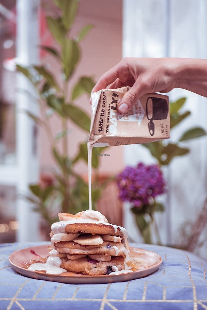 Plump banana and blueberry pancakes, served with sliced banana and Oat…