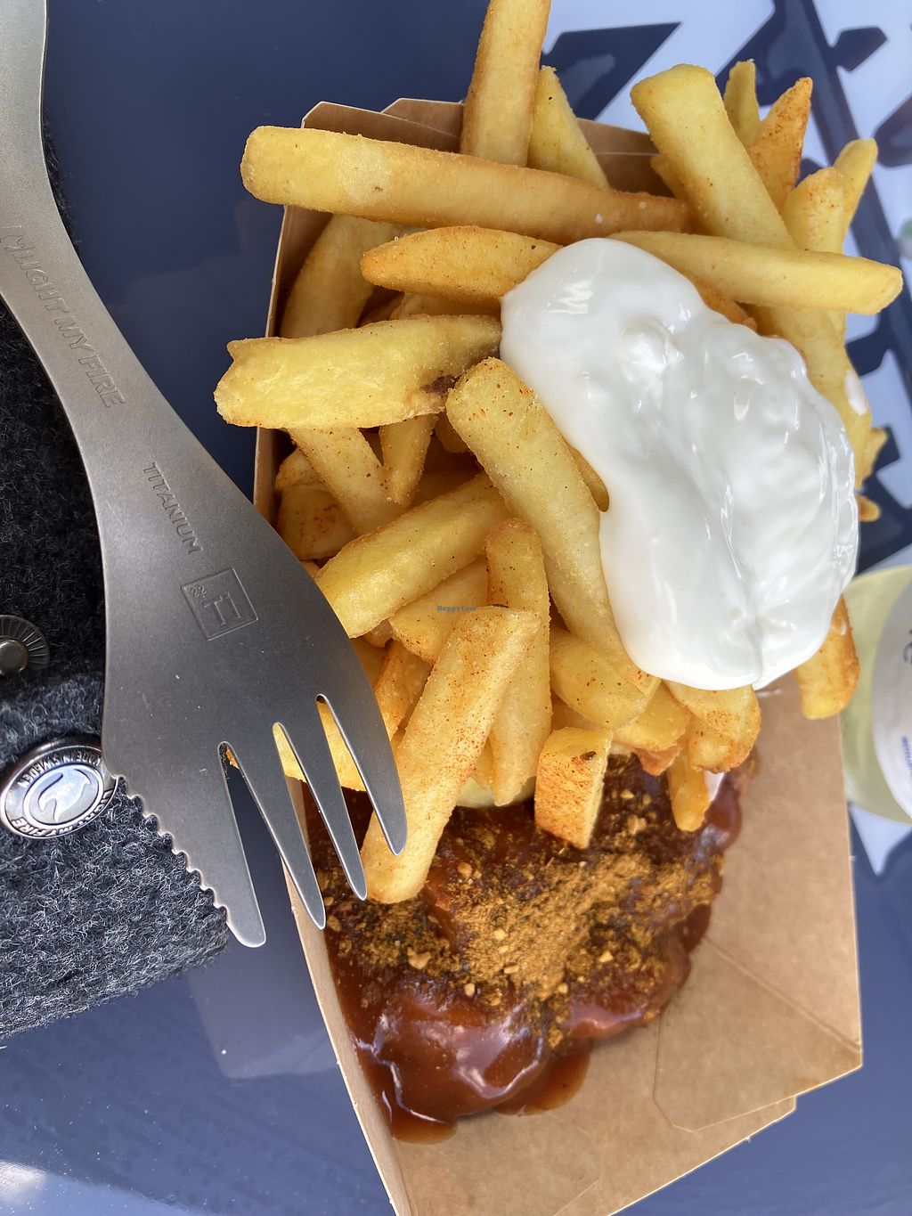 You can order fries and vegan curry sausage. Only Available dips are mayonnaise and ketchup.
