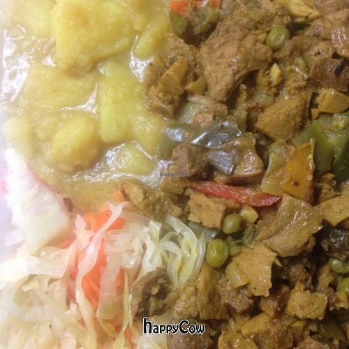 I had the curry veggie chicken with rice and peas, curry potato and cabbage. Amazing. Spinach patties were great as well.
