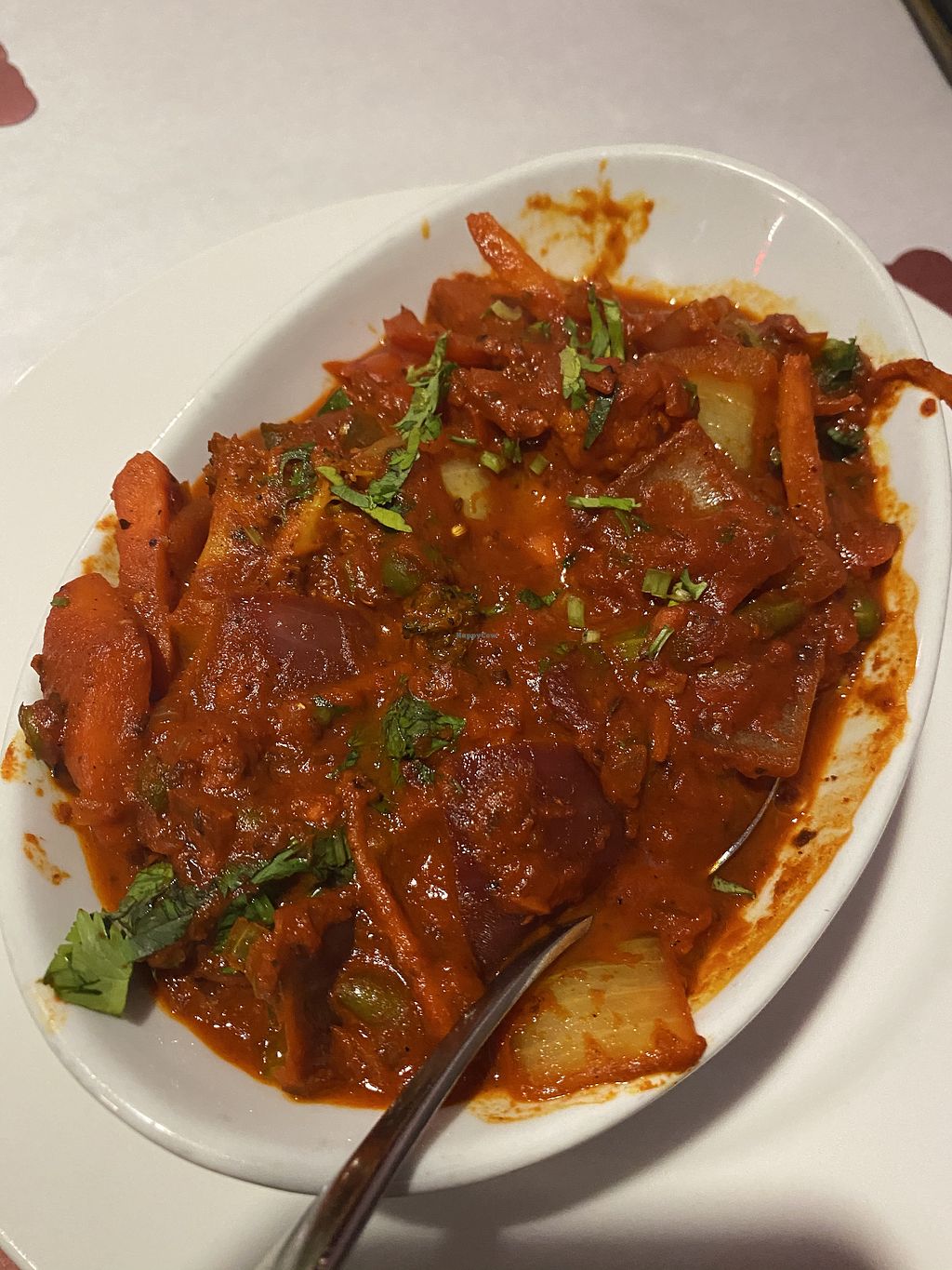 Quite a few dishes to choose from which were vegan, even appetizers. My wife and I had the masala dosa. I also had the mulligatawny soup. For dinner we had the aloo gobi which is a favorite of mine and Manglorean vegetables, vegetables simmered in a coconut sauce. We forgot to ask for mild but the dishes weren't extremely hot although they were very flavorful. Everything we tried was excellent. The aloo gobi was some of the best I've tasted. The Manglorean vegetables was a nice change too as the only vegan dishes at a omnivore Indian restaurant are usually chana masala and aloo gobi. The staff were very accommodating in telling us what was vegan and also double checked with cook without us even asking. If we lived in the Tampa Bay area we'd be here often. Very good experience. I would give it 5 cows if I could.