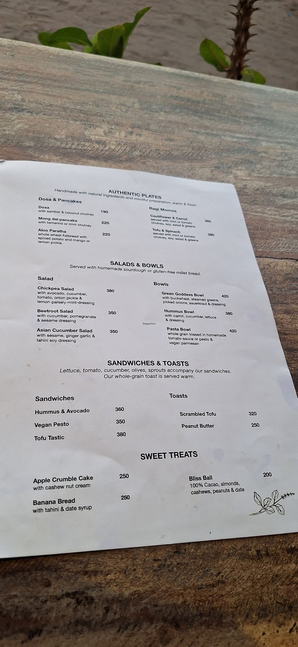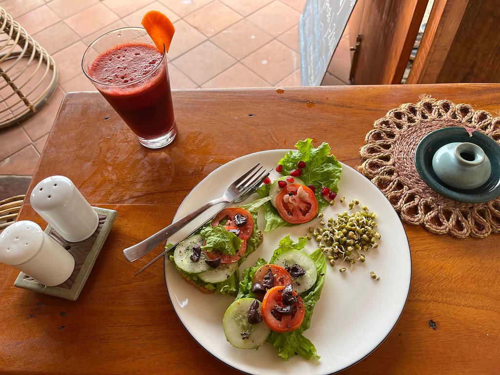 A peaceful fully vegan café with a sea view serving fresh juices, salads, sandwiches, pasta, and house-made plant-based milk with love & care. Enjoy high-quality coffee, herbal teas, and sugar-free, gluten-free cakes and breads. The menu may include avocado & hummus sandwiches, pesto sandwiches, tofu tastic sandwiches, salads, millet noodles, and pure fresh juices and smoothie bowls. Open Mon-Sun 8:00am-8:00pm.