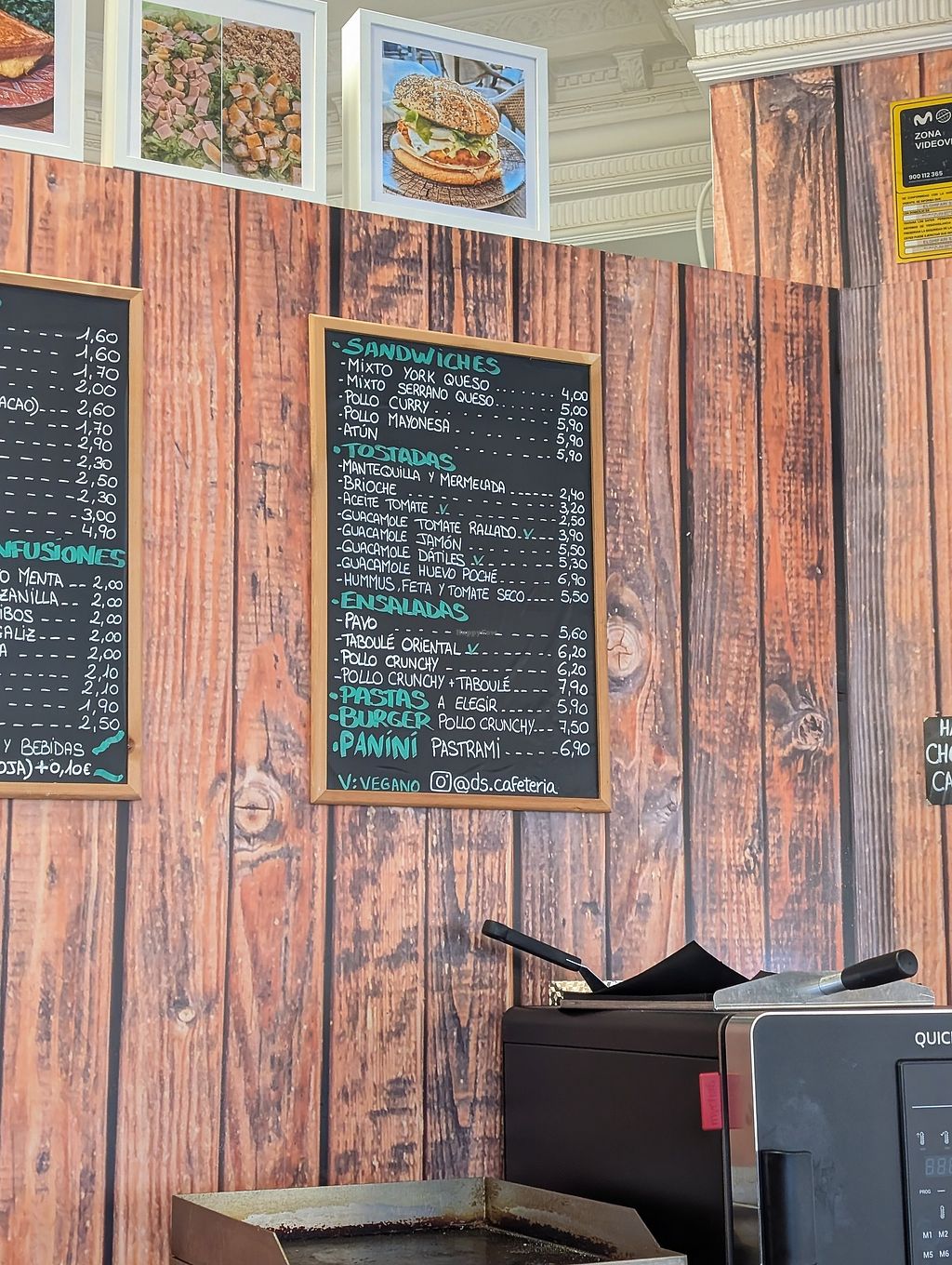 Precios, porej, café 1'7€, tostada mermelada 2'4€.