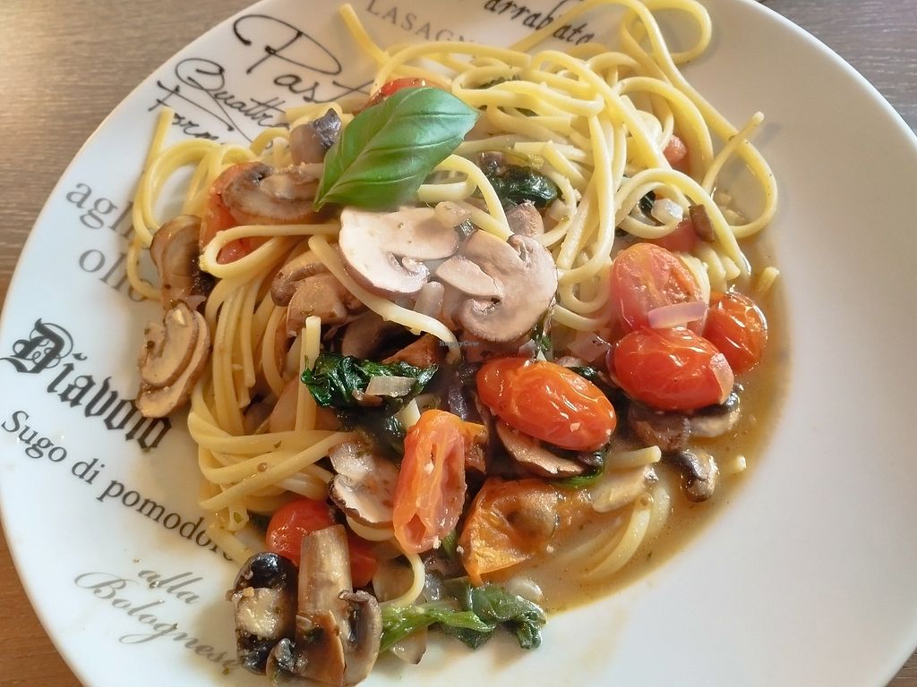 Pasta und Pizzateig sind vegan. Ich konnte praktisch frei zusammen stellen. Habe mich auf eine Empfehlung der sehr freundlichen Bedienung verlassen und es war super lecker. Spaghetti mit Spinat, frischen Cocktailtomaten und Zwiebeln.