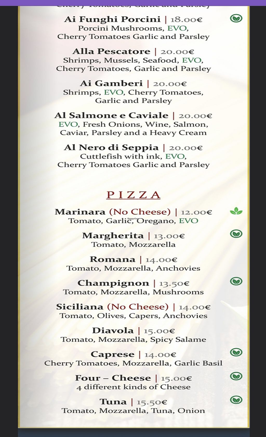 Wij hadden de bruchetta (lijkt wel een pizza) en de funghi. Allebei heerlijk. Daarna een pizza vegetariana zonder kaas. En pasta met paddenstoelen en tomaatjes. Allebei heel goed. De pizza was heerlijk krokant met in het midden een mooie dunne bodem. Best pizza ever in mijn nu 4 jaar vegan leven. Dit alles op een mooi terras naast een park. Aan de kust.