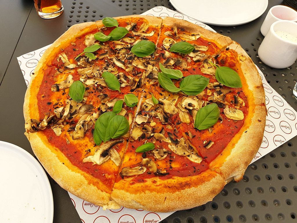 Serves meat, vegan options available. Pizzeria offering one vegan pizza on the menu with an option to add/choose toppings. Open Mon-Thu 11:00-22:00, Fri-Sat 11:00-23:00, Sun 12:00-22:00.