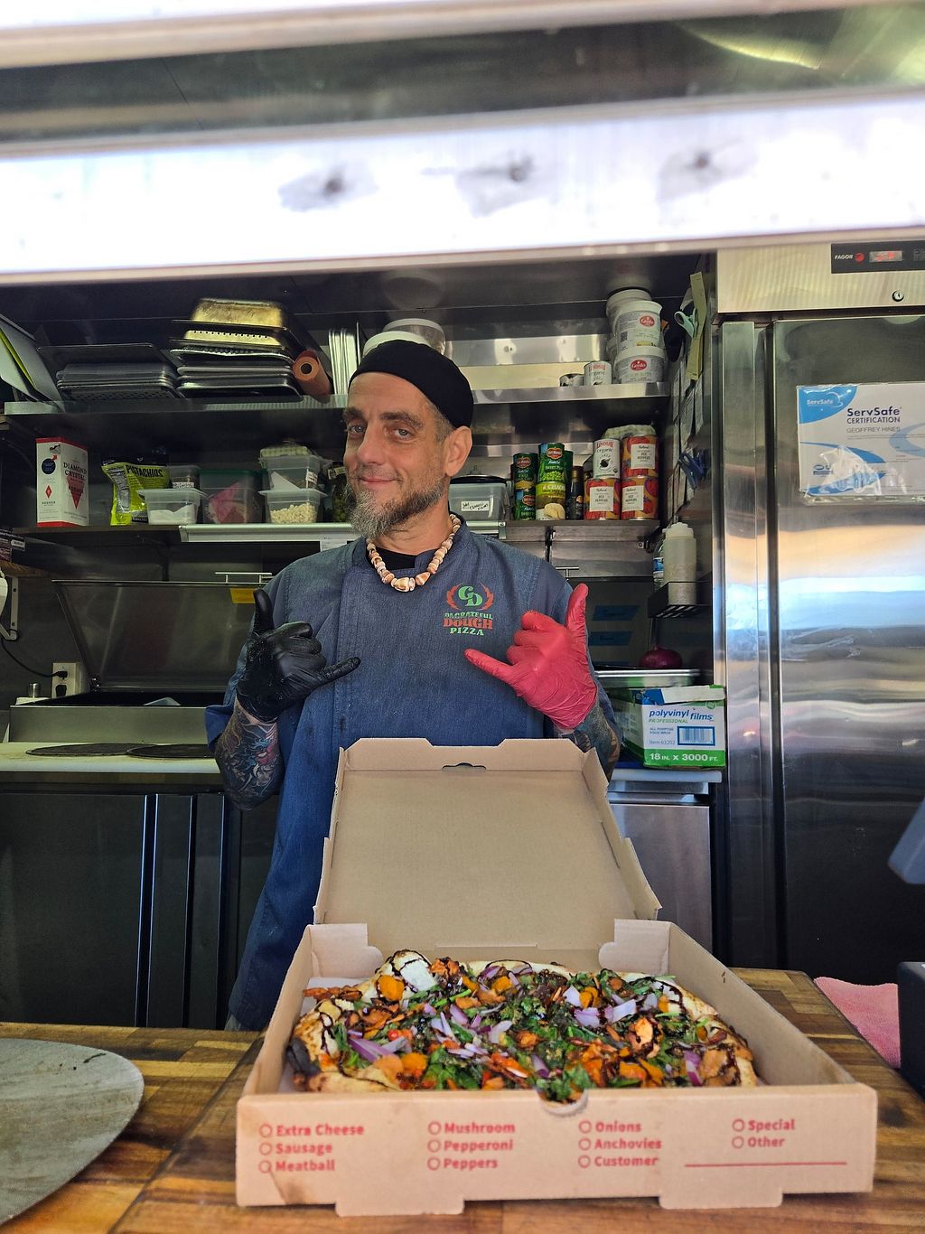 Serves meat, vegan options available. Food truck offering made-to-order pizzas with vegan options such as vegan cheeses and vegan bacon. Vegan choices include Da Supreme Margarita with vegan cheese, Da Fig-Get-About-It with optional vegan bacon, or the option to build your own pizza with mostly house-made toppings. Open Mon 10:00am-8:00pm, Tue-Sun 10:30am-8:00pm.