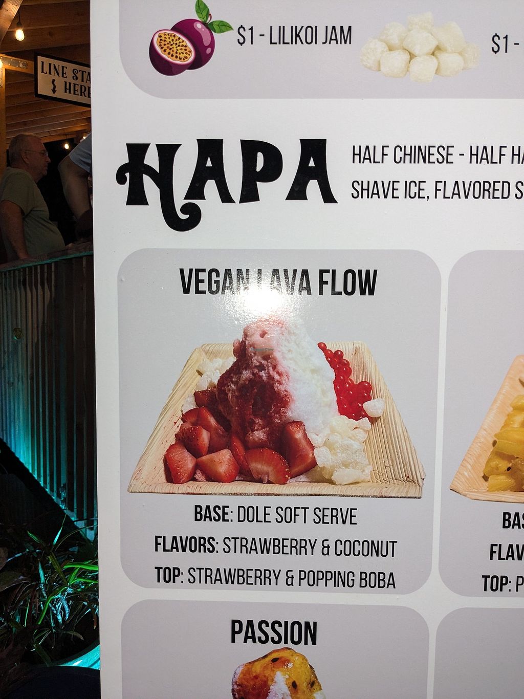 Very vegan friendly, we were able to get vegan coconut condensed milk and dual whip instead of the dairy options. The flavors are so intense. We got the vegan lava flow and also the sunset but with the vegan condensed milk and dole whip.