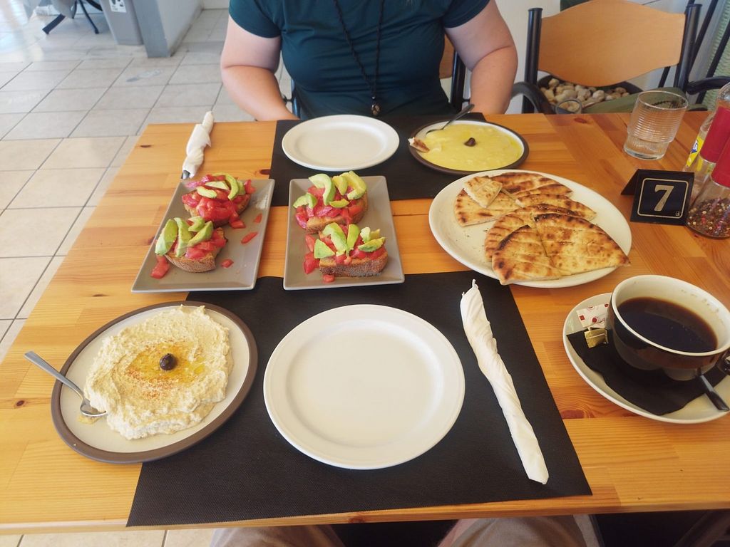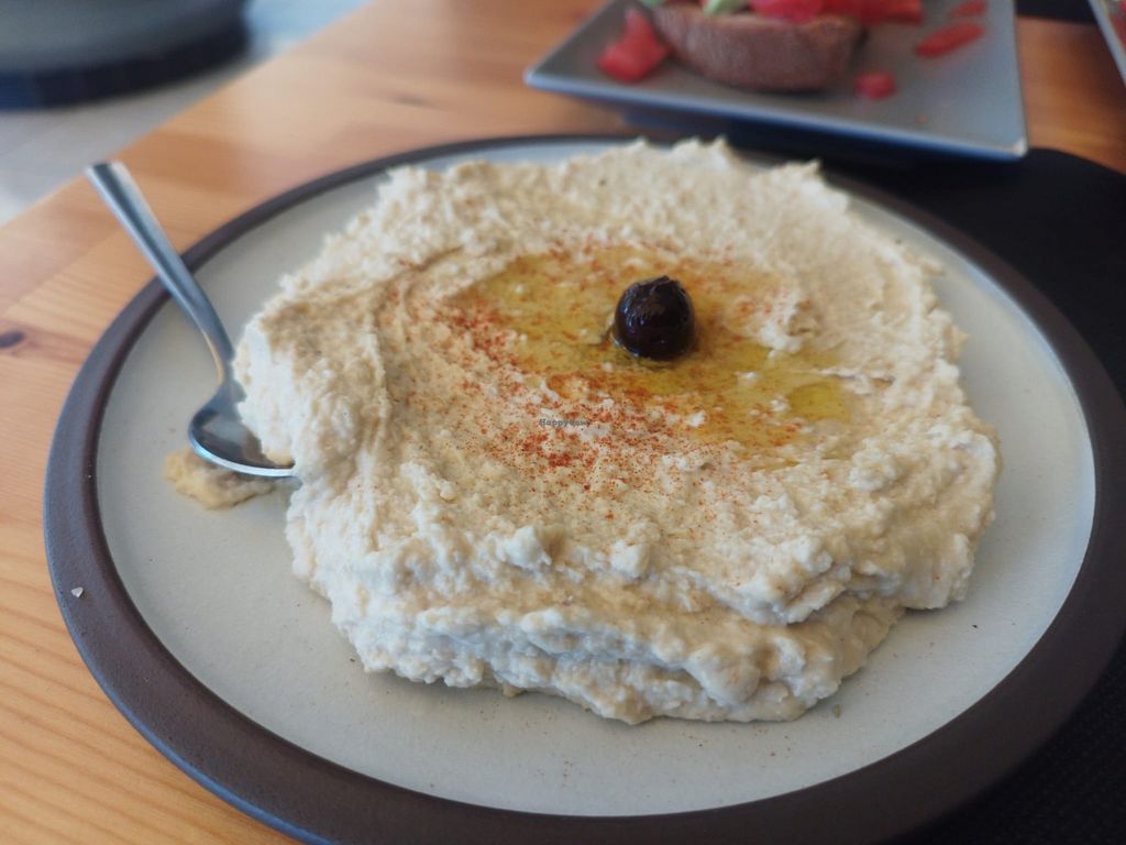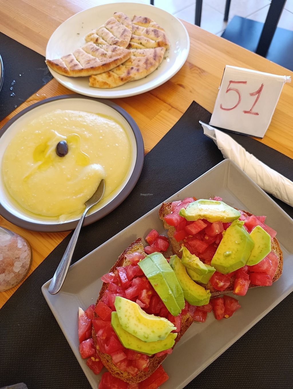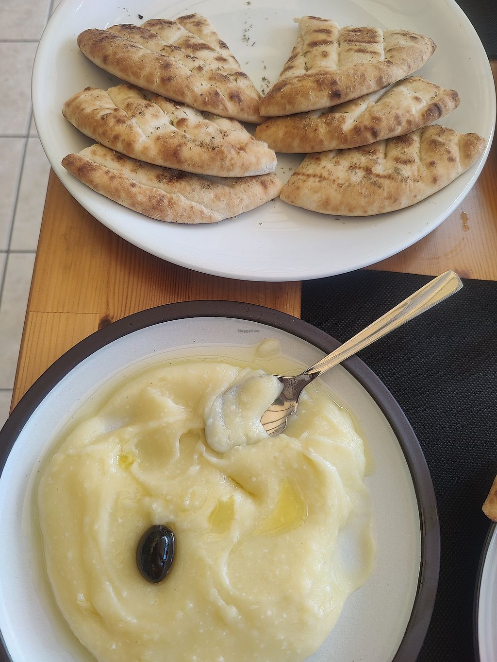 Vegan bruschetta, garlic mash potato dip and pita bread