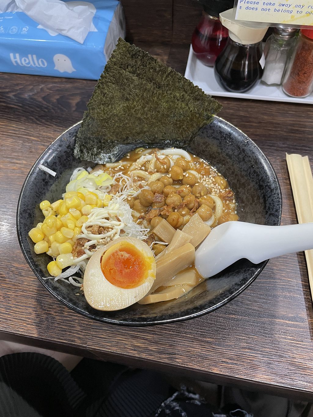 A small, cute restaurant with limited seating. You can watch the chef prepare the food. For the curry chickpea with noodles, you can choose between ramen and udon. You can also choose to add egg. The curry udon is a bit spicy and is served with chickpeas, corn, spring onions, bamboo shoots, sesame seeds, a seaweed sheet, and cabbage. At 2,200 yen, it's relatively expensive for Japanese ramen, but highly recommended.