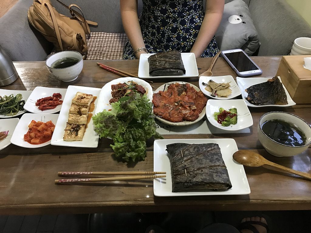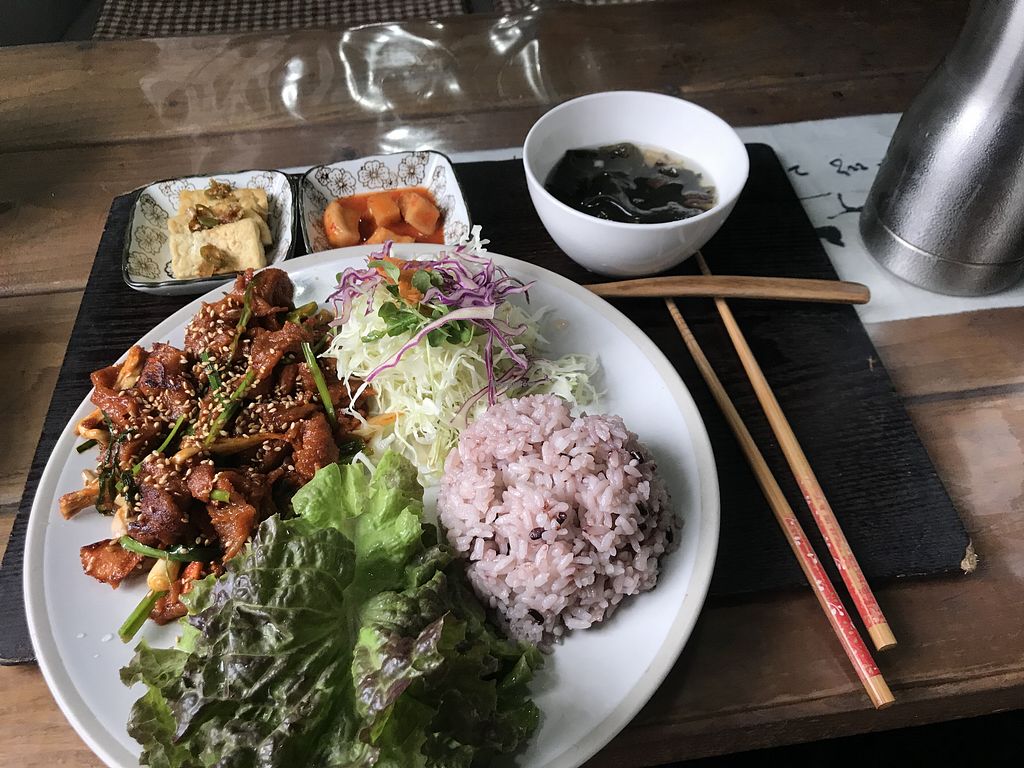 Lotus meal: includes kimchi pajeon, wheat bulgogi, and lotus-cooked ri…