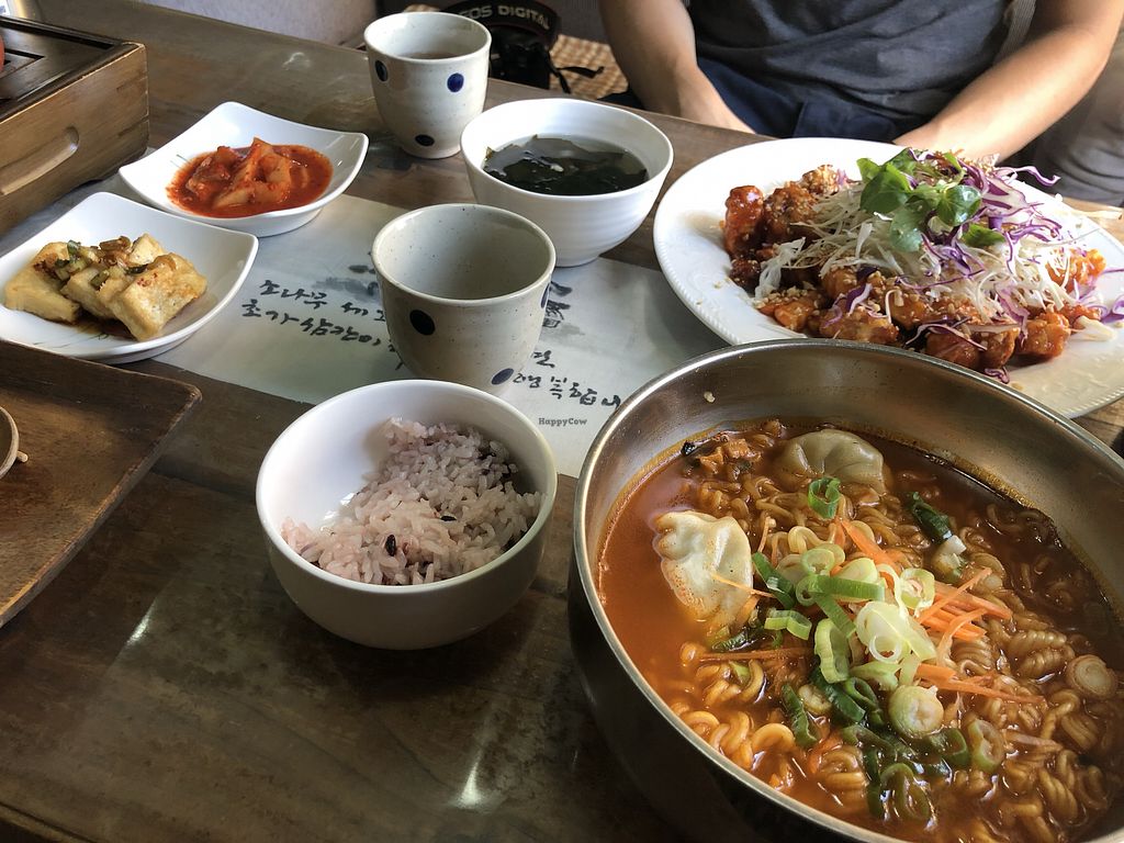 Vegetable Ramen with dumplings & fake chicken dish