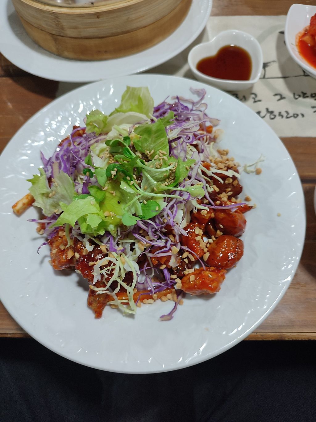 Vegan chicken in sweet sauce and ramen