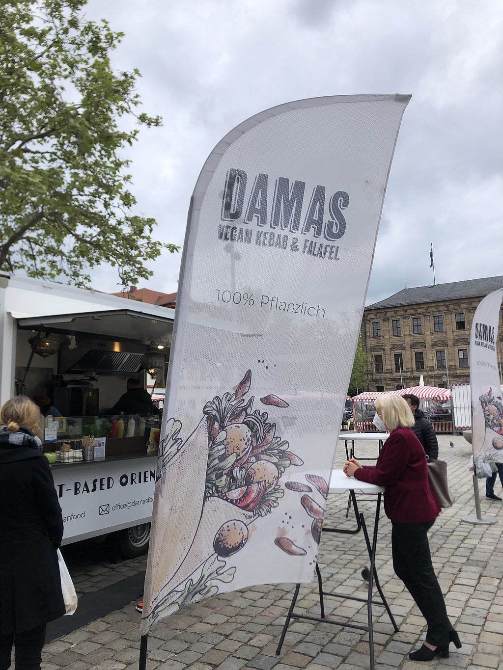 Not vegan anymore. He opened his food truck right in front of the vegan food vendor Vegöner and shouts at customers of Vegöner that his food is better. It was previously forbidden for him to continue selling on the market in Erlangen for failing to comply with hygiene concepts.