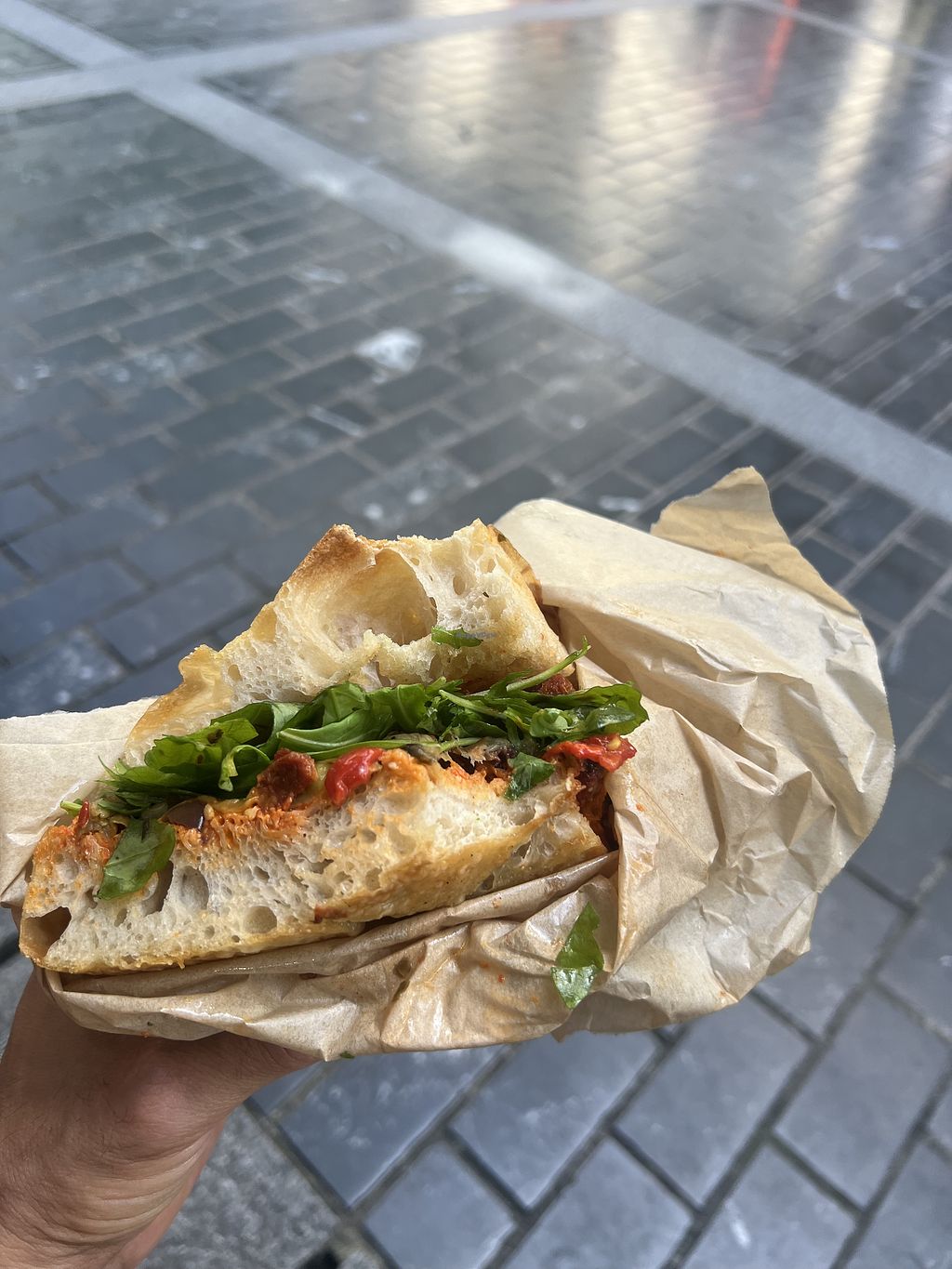 Not cheap but a HUGE and very full focaccia sando with lots of veg and a delicious tomatoey cashew spread that felt like they’d actually made an effort. And very friendly staff!