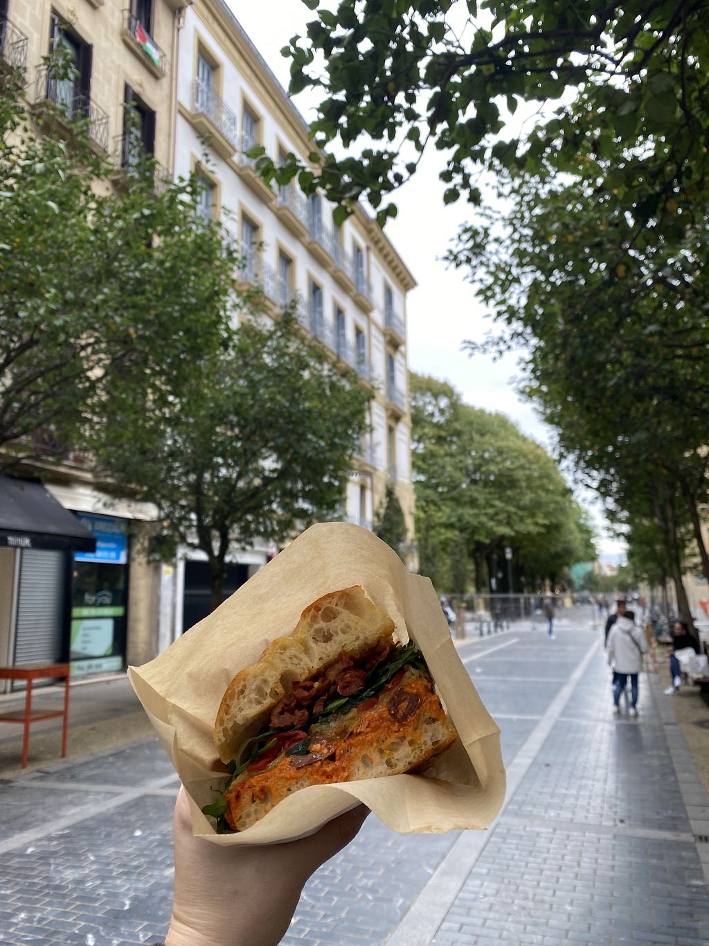 When we visited the store, she had two vegan options. We chose the one with sun dried tomatoes, fried eggplant and peppers, arugula, olives and a spread made of cashews and tomatoes i think. It was the best thing ate in San Sebastián!