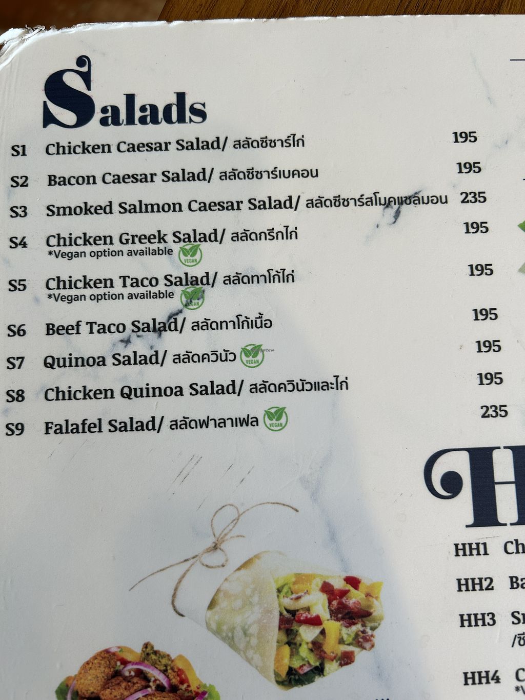 A modern bakery and cafe located on Ratchaphruek Road, serving an international menu of breakfast and lunch items. The menu features a substantial selection of clearly labeled vegan dishes, including a "Vegan Swiss Cheese Reuben" on rye bread, falafel wraps, and hearty salads like quinoa or taco salad. The cafe offers a variety of plant-based milk options for coffee, including almond, pistachio, and oat milk. Open Mon-Sat 7:00am-7:00pm.