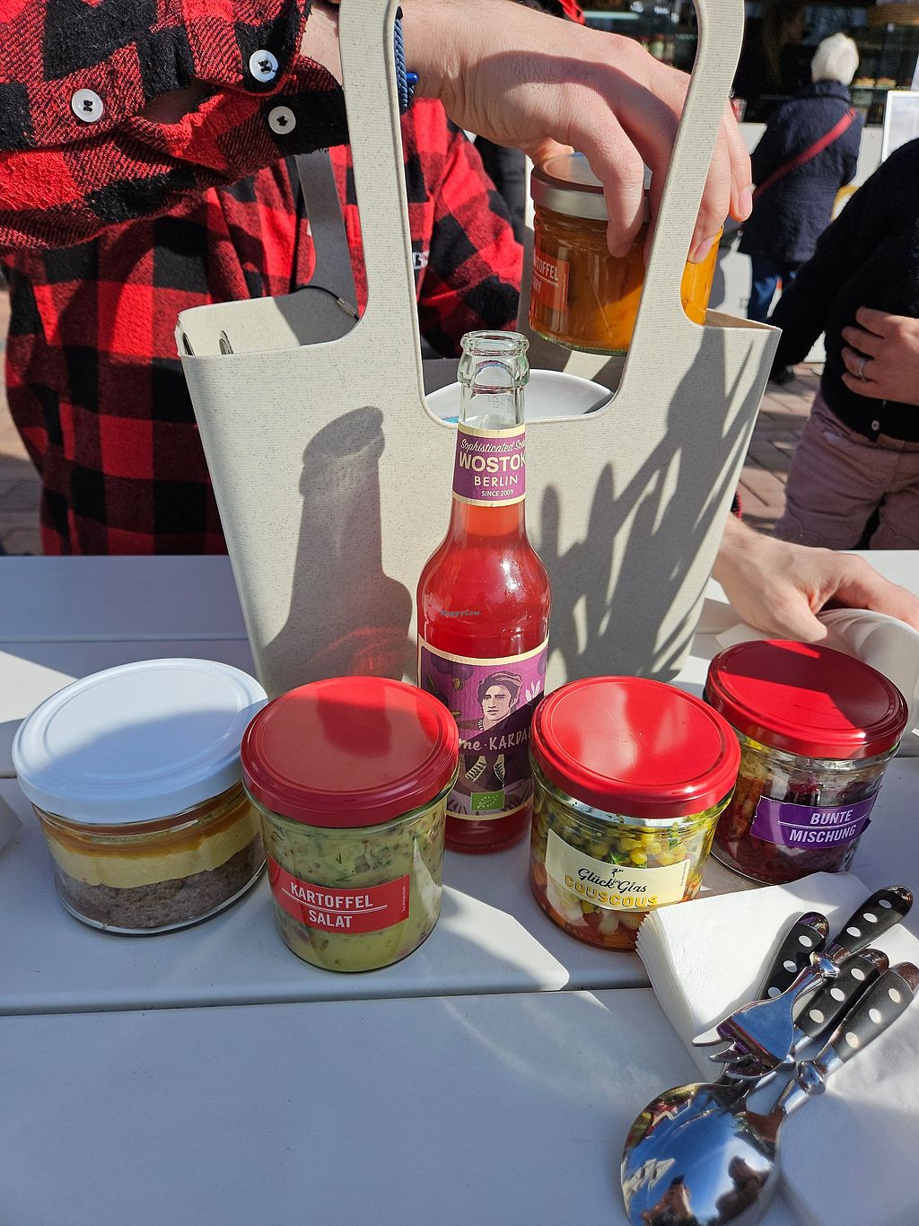 What an adorable concept. You find a table outside on the terrace and pick up your food and drink at the self service kiosk. They give you your order in a picnic basket to carry back to your table; I think you can also order through a QR code instead of queuing but not sure. Most of the salads, half of the hot food options and two cakes are vegan, everything is clearly marked. Different plant milks available for coffee with no surcharge. We had the couscous with veggies, Bunte Mischung (pickled beetroot, cabbage and cooked grains), potato salad, sweet potato curry, clementine cake and pumpkin marble cake, and oat milk cappuccinos. Everything was fresh and super tasty. The potato salad was especially delicious with fresh dill and whole mustard grains. Thoroughly enjoyable experience; how cool to have such a cute eatery in the middle of the botanical gardens!