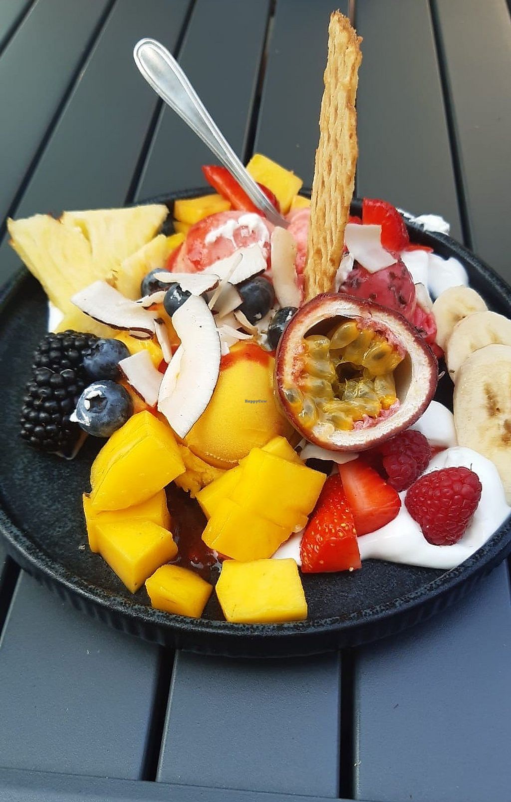Ich hatte den veganen Tropical Becher mit Kokosjoghurt, Erdbeer- und Mangoeis sowie ganz vielen frischen Früchten. Kann ich uneingeschränkt empfehlen!