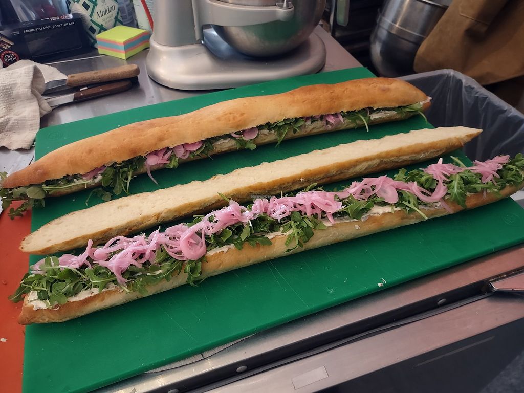 Hummus, arugula & pickled red onion on baguette. Vegan and vegetarian …