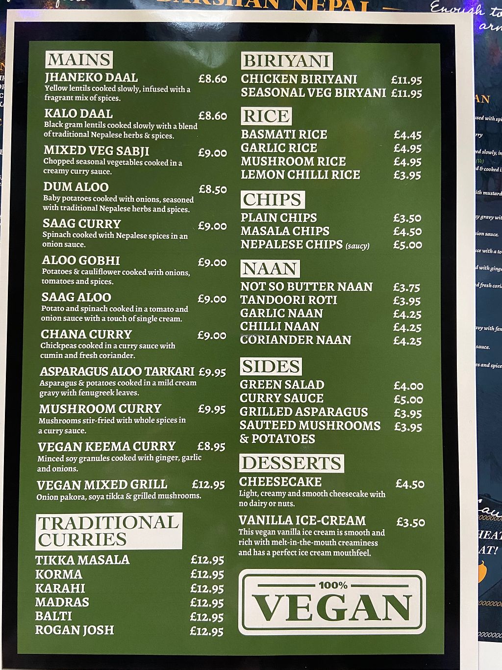 Pretty extensive vegan menu, and adaptable non-veg options too. They even have vegan naan! I’ve tried most of their options now but the Himalayan soya curry is my favourite! Although the vegan mixed grill is a close second. Have only had takeaway though, so will be booking for a sit-down meal soon