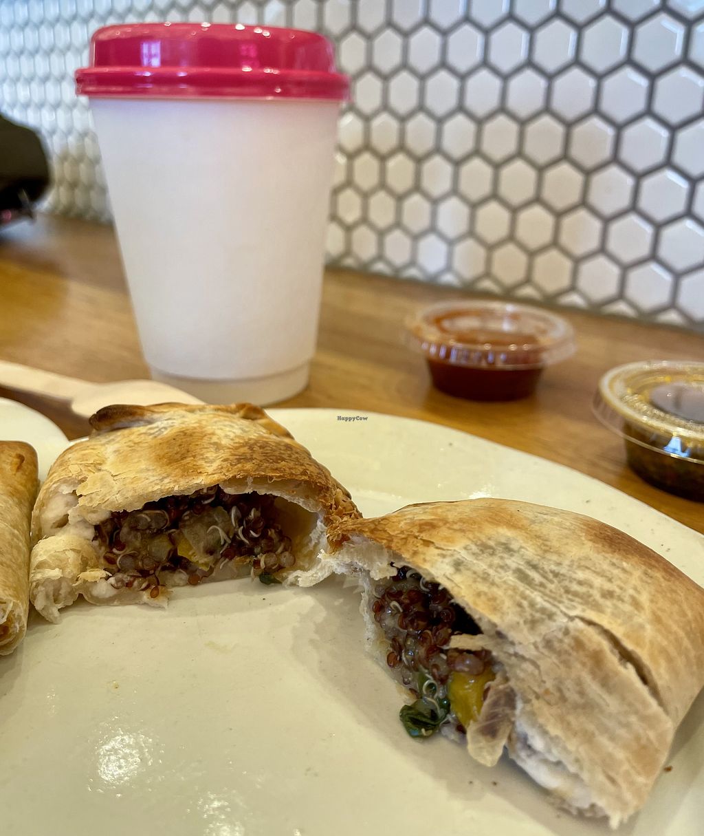 Lovely and cute cafe offering oat or soy milk with good coffee. They have clearly marked they’re vegan options on the menu board including the quinoa empanada and potato and cheese empanada both (both of which I tried) and a vegan burrito. The empanadas were lovey and I had two which filled me up well for breakfast. The sun shines gloriously on the cafe I would definitely recommend.