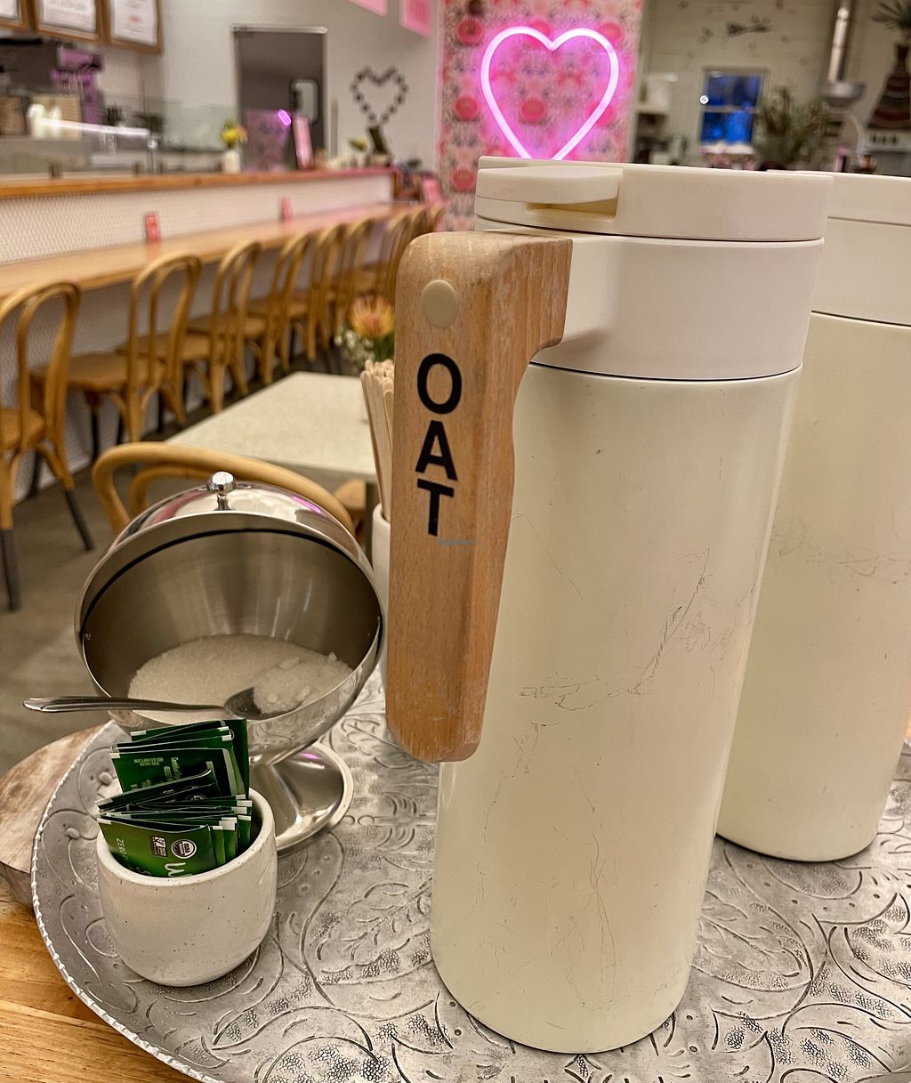 The coffee drinks are unique with options like the churro latte and the rosemary latte. They offer almond and oat milk alternatives, and have two vegan food options, a few vegetarian options, and vegan chocolate.