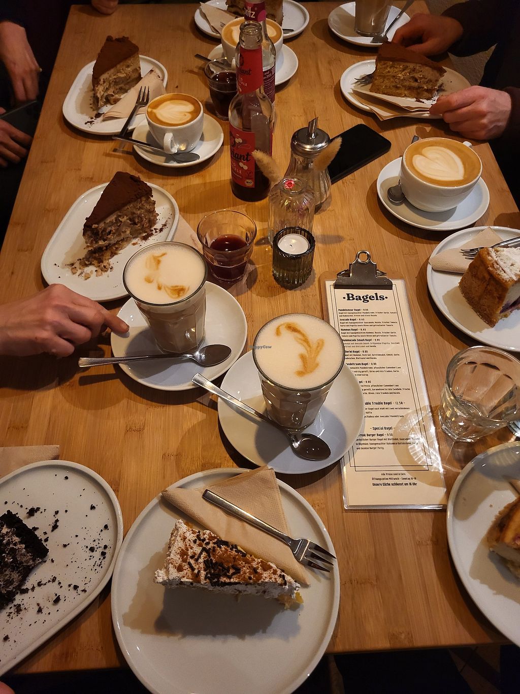 Alles vegan. Eigentlich mag ich Bagels nicht besonders, aber hier sind sie extrem lecker und die Kuchen sind auch sehr gut. Sehr freundlicher Service.