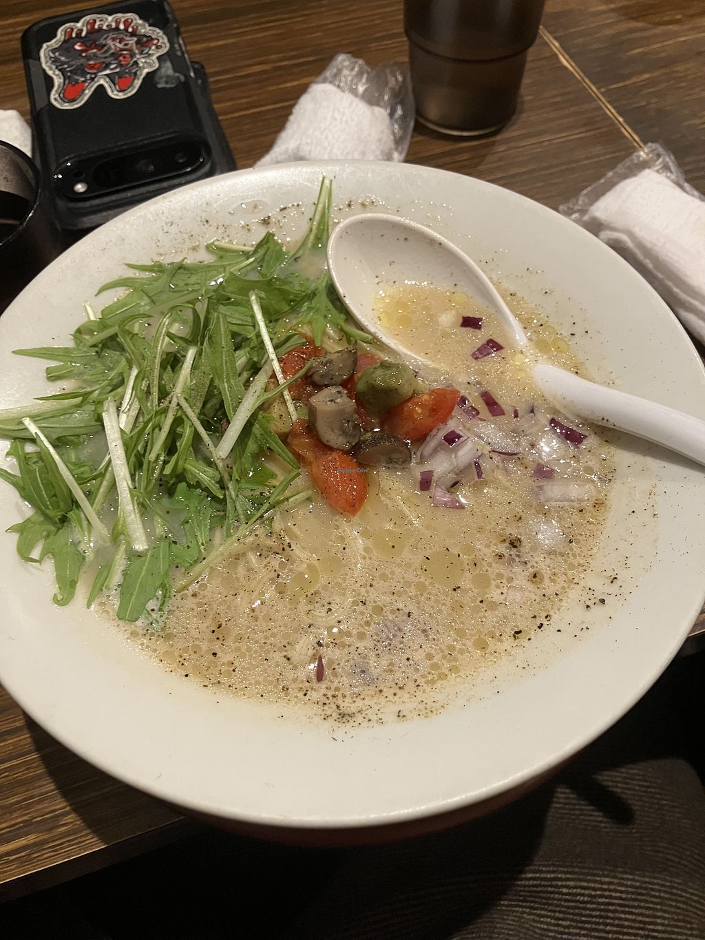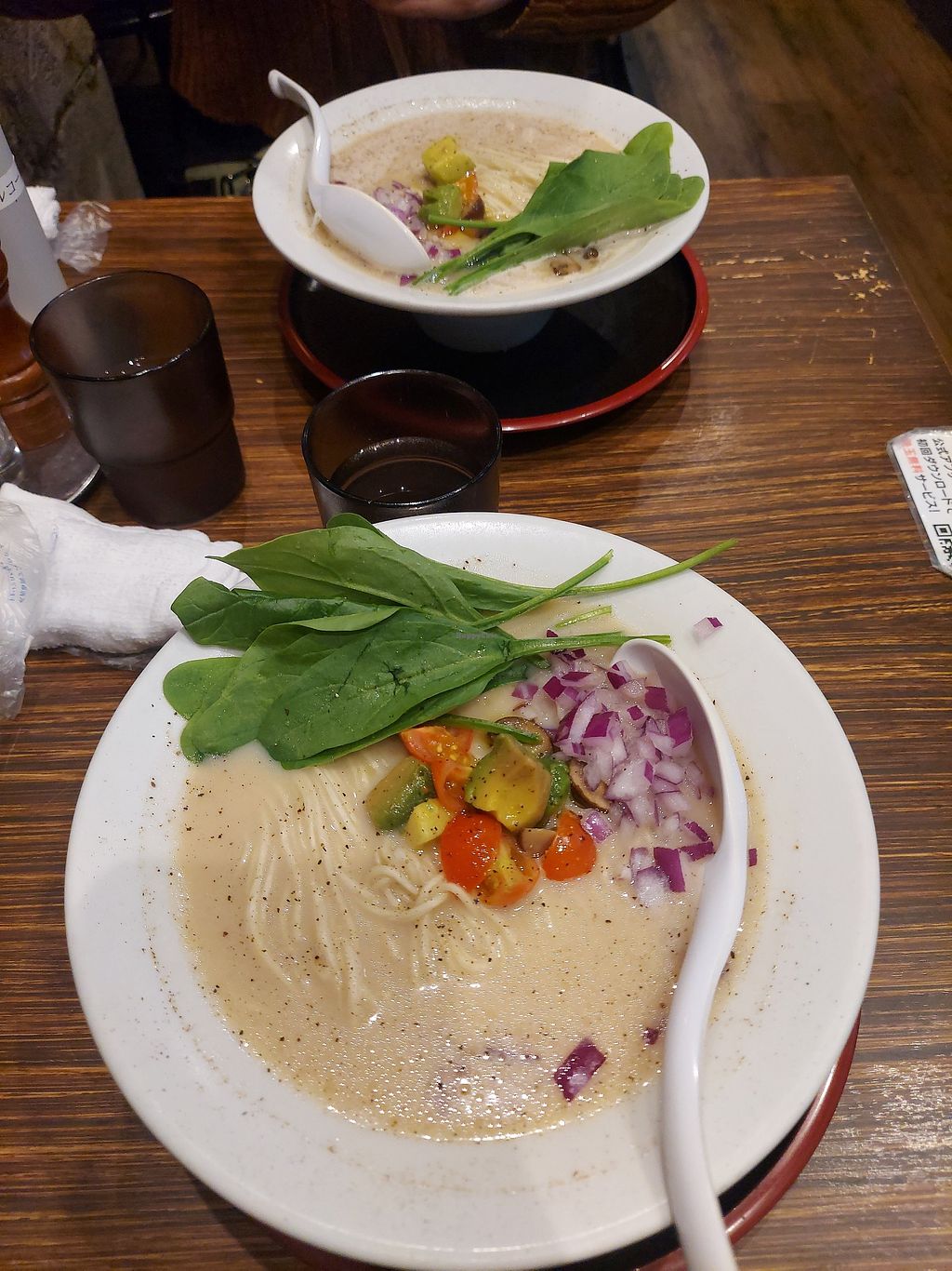 The vegan ramen is good but a bit uninspired toppings. Would be nice with some tofu atleast or more veggies but a very tasty broth and noodles either way.