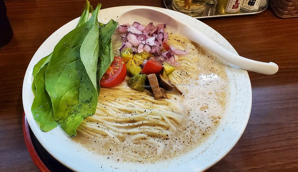 Noodles made on-site. Vegan ramen is served in a miso-soymilk soup with tomato, avocado, onions, and some greens. Service is friendly and fast. It appears to be only available in the evenings. Easily ordered using the machine at the door, including ordering extra noodles. A translation for the machine is available in multiple languages.