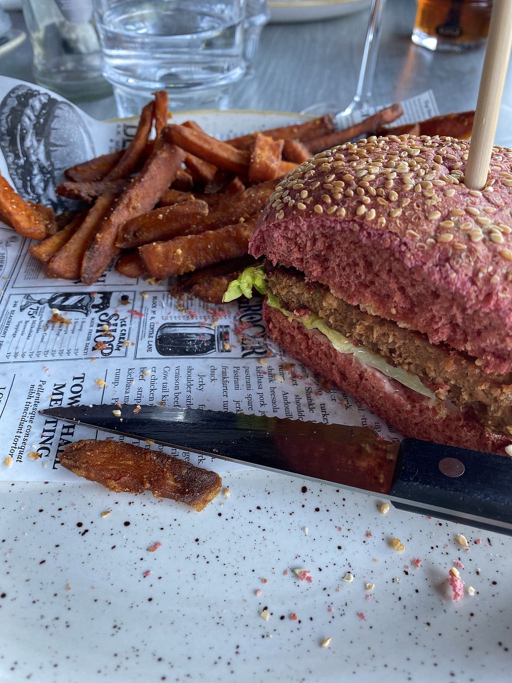 Met een gezelschap niet veganisten hier gaan eten. Er staat één veganistisch burger broodje op de kaart. Helaas was deze aan de droge kant. De zoete aardappelfrietjes waren wel goed.