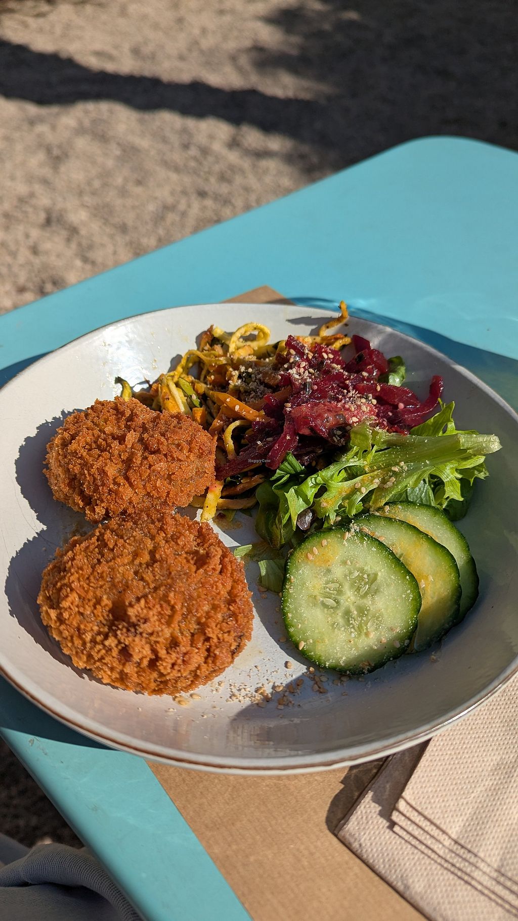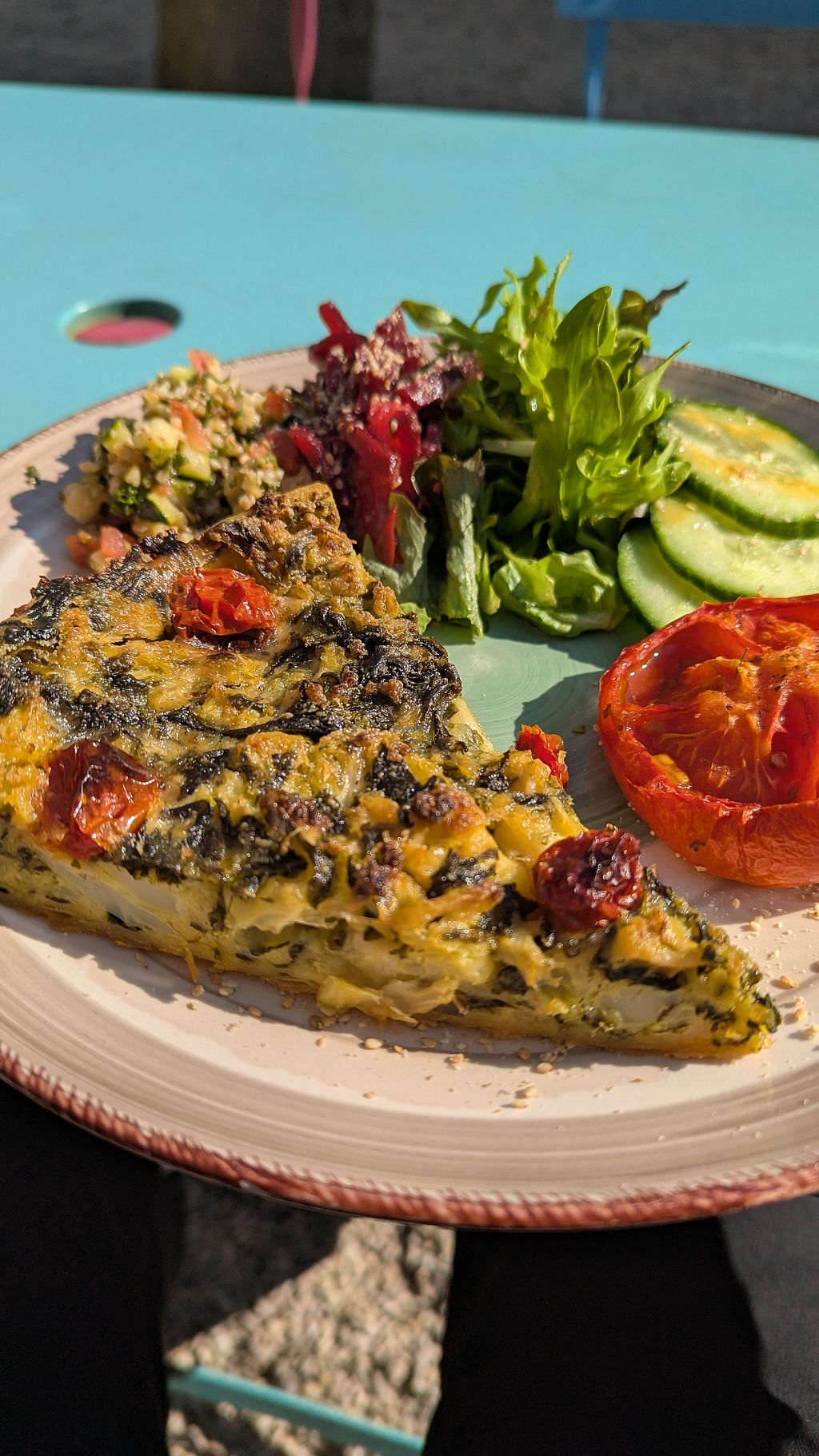 The quiche and arancini were very tasty, with a nice assortment of side salads accompanying them. Modest portions but leaves room for dessert. The vegan cheesecake was beautifully presented. Texture could be better - I think probably cornstarch or similar was used to thicken the filling, making it less rich than other methods.