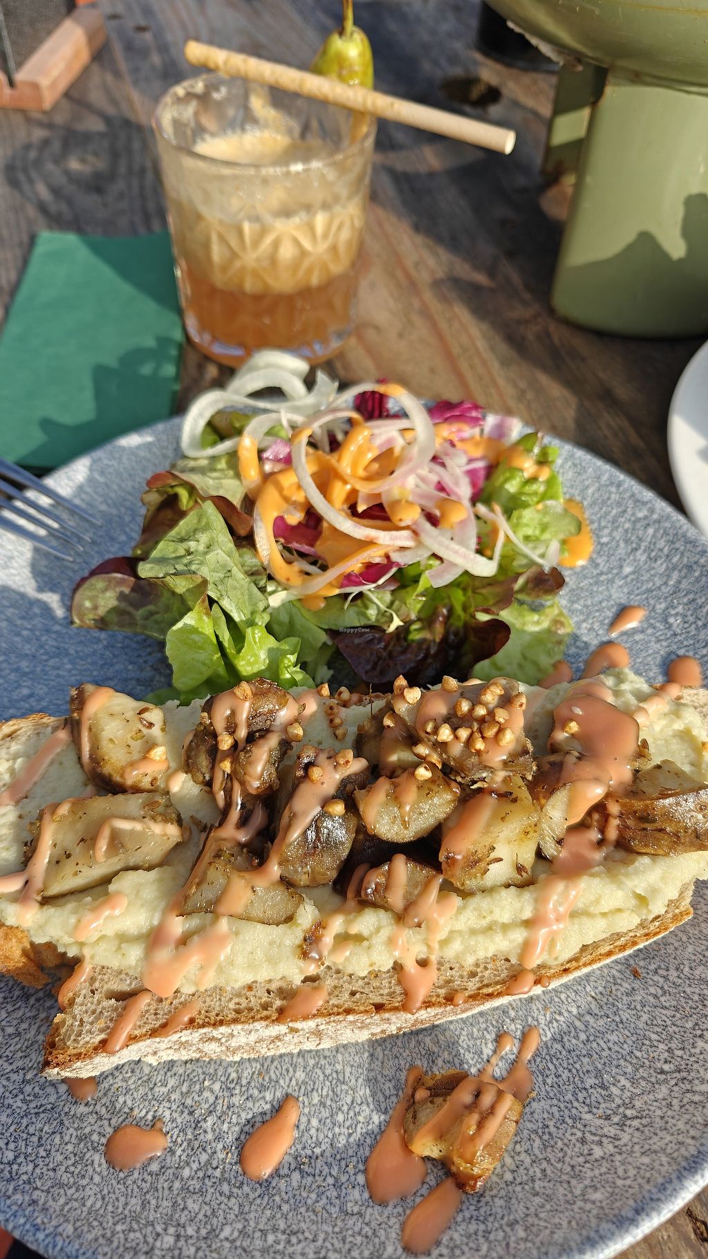 Dat ik als veganist deze plek nog niet kende, verraste me, zo dichtbij ook. Even zoeken hoe je er komt, maar dan beland je op een originele plek met restaurant en terras praktisch in het bos. Hond is welkom. Een zeer creatief en ambitieus project door een ondernemende eigenaar opgezet. Helaas konden we niet uitgebreid eten omdat er een privé feest was vanaf 17 uur (had ik nergens op de site gelezen) maar borrelplank je voor 2-3 personen smaakte goed, het wijntje ook en mijn gezelschap had de moussaka die ook heerlijk (smokey ) was. De wc’s zijn creatief ‘opgelost’, wel een beetje door woke elementen heenkijken. Perfecte plek om