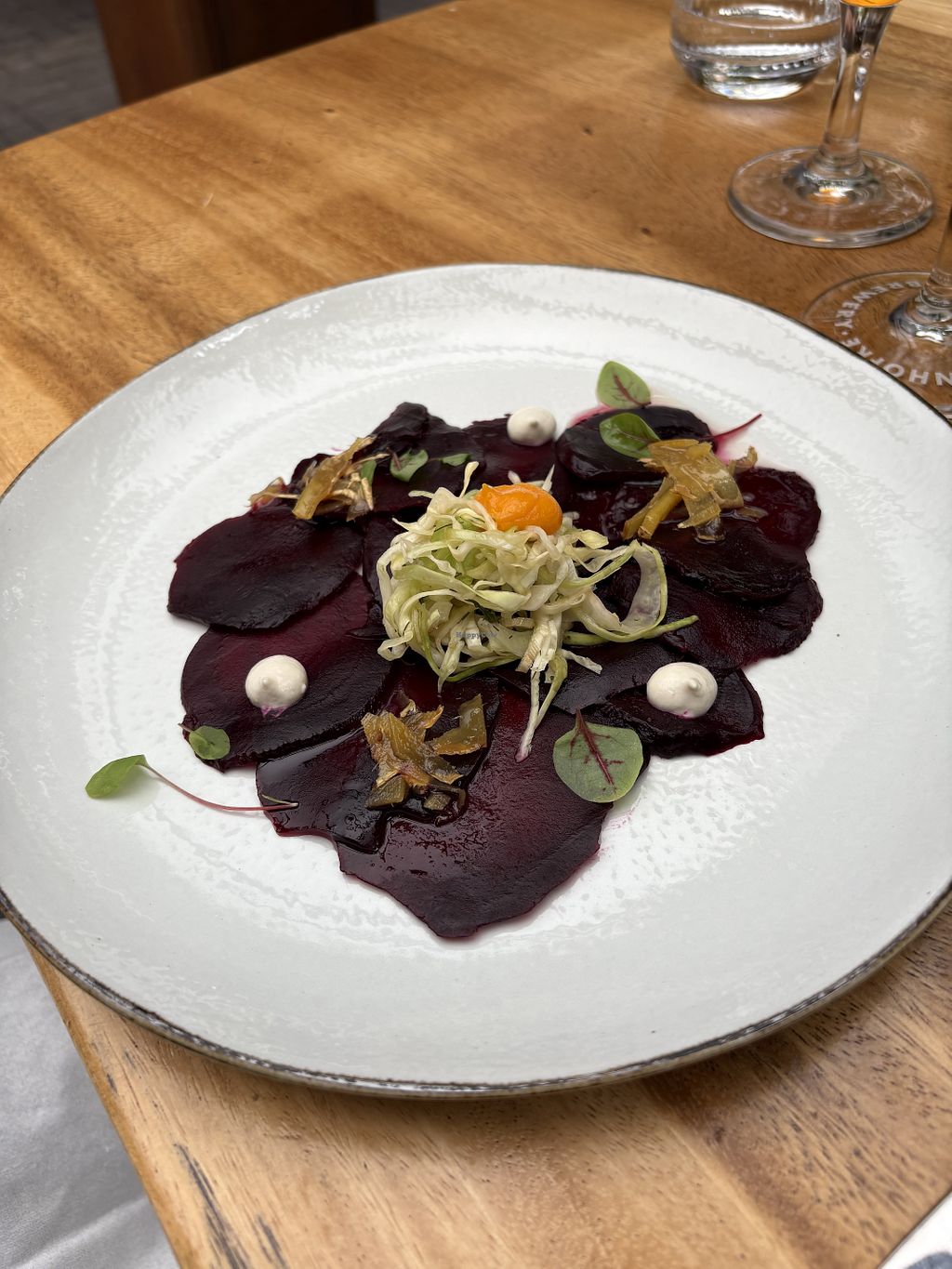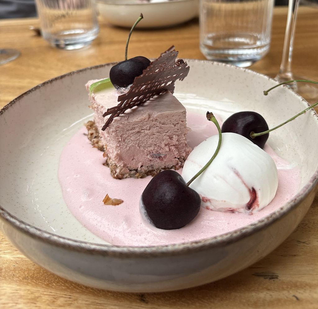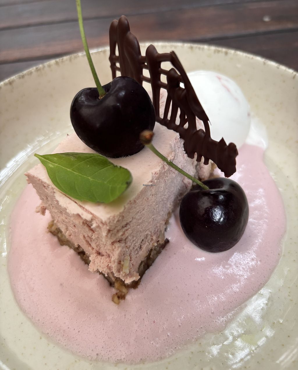 Cherry cheesecake on a bottom of dates and nuts, with cherry saus, yog…
