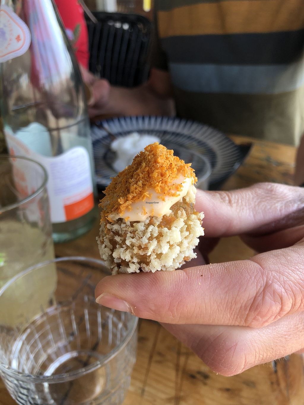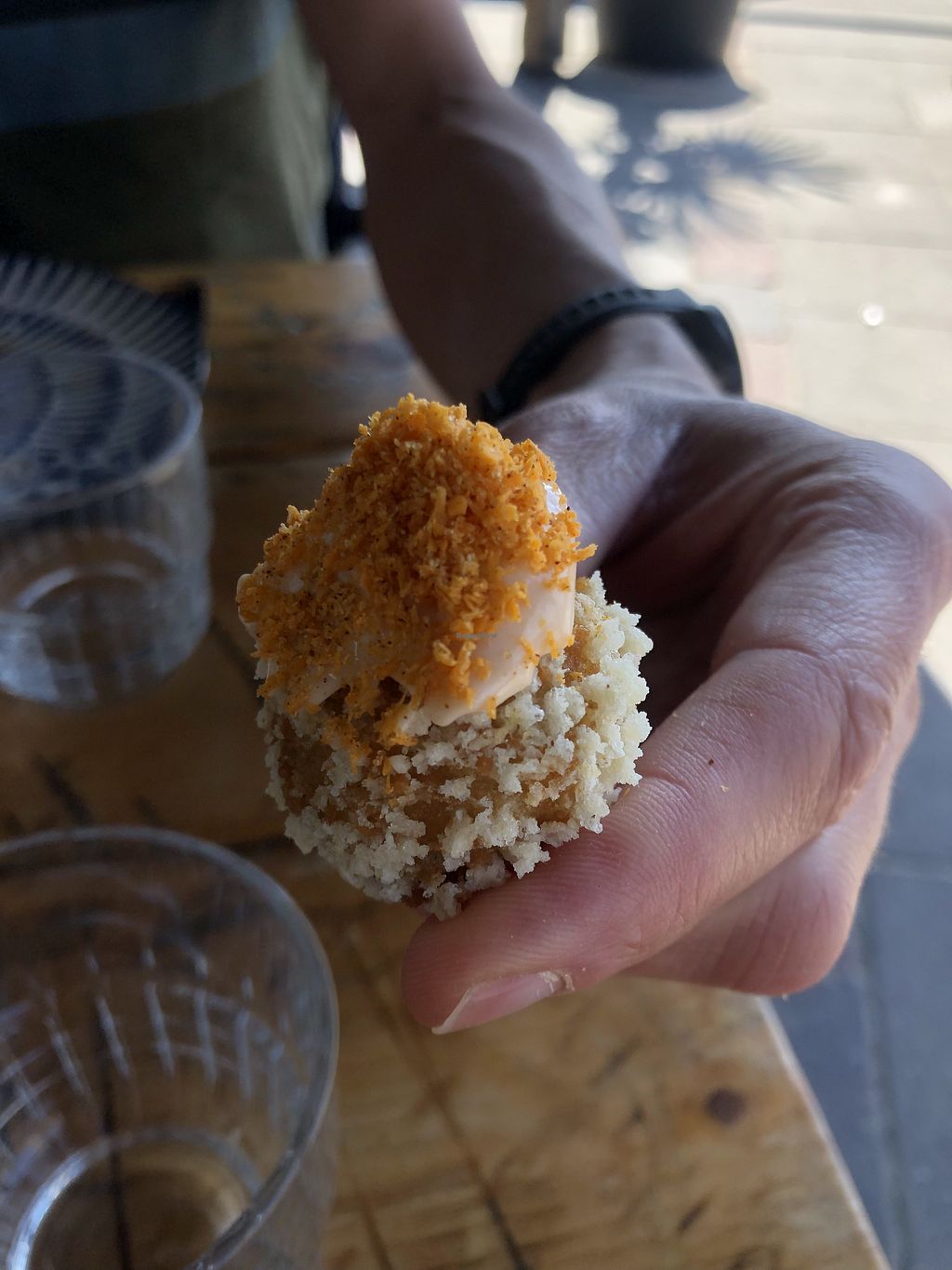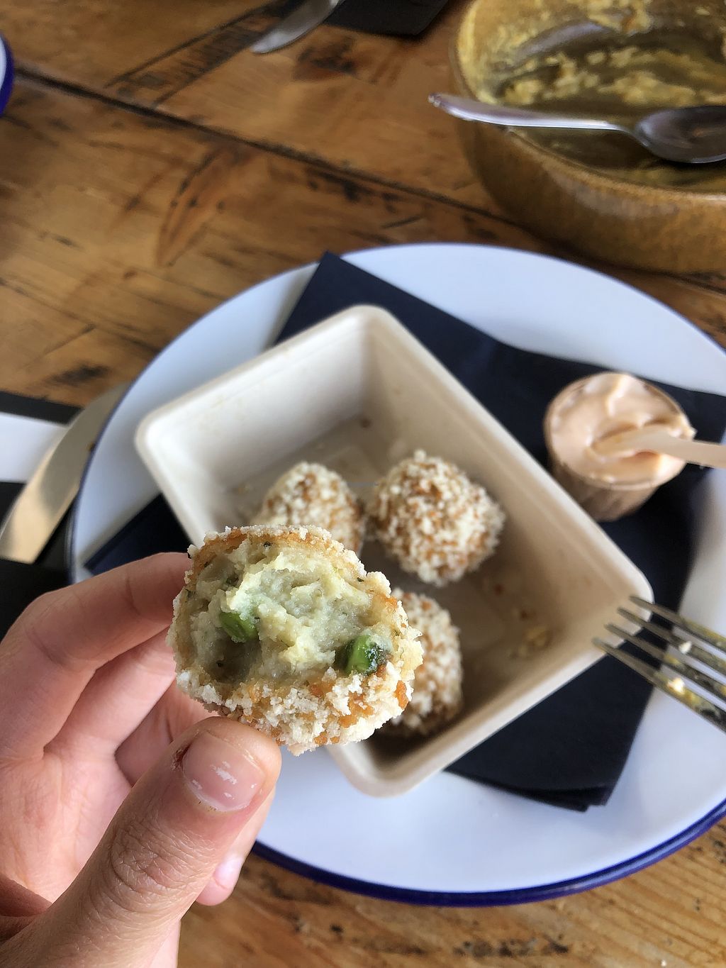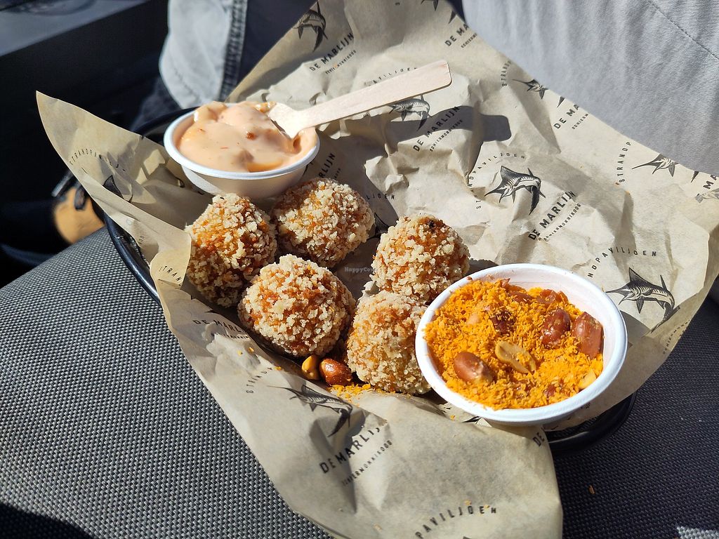 De vegan ballen van kokos curry hebben we geprobeerd bij de borrel. Het leken een soort vegan bitterballen, ze smaakte niet echt naar kokos of curry maar waren wel erg lekker en ook het sausje erbij was lekker.