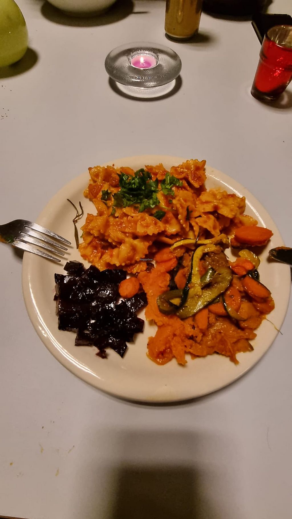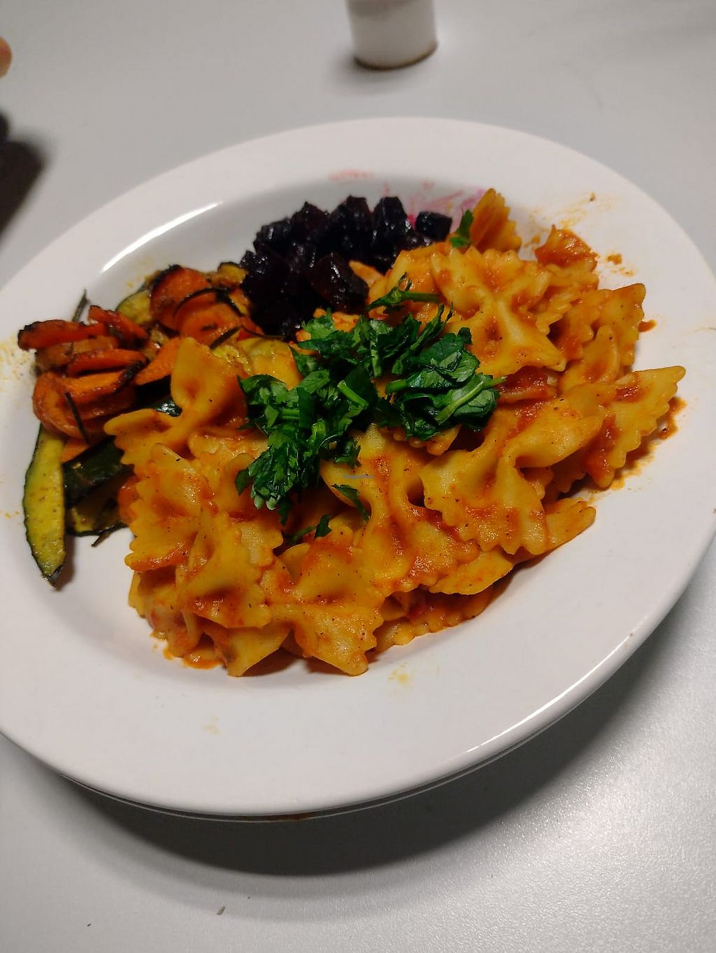 Pasta with sweet and spicy tomato sauce along side roasted root vegeta…