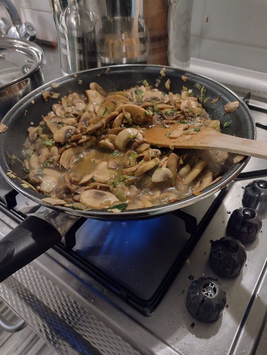 Left pan: Stir fried veggies and green beans. Right pan: Sautéed mushr…
