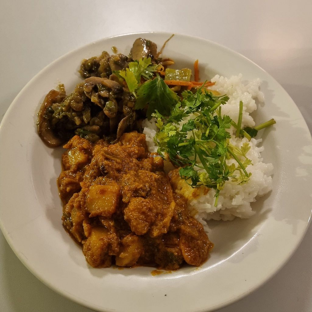 Thai curry along side aromatic basmati rice and sautéed mushroom mixtu…