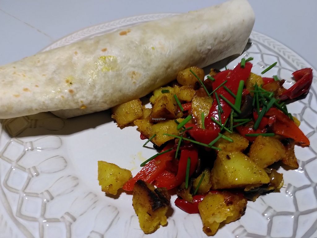 Veggie burger with roasted potatoes and sweet paprika sauce