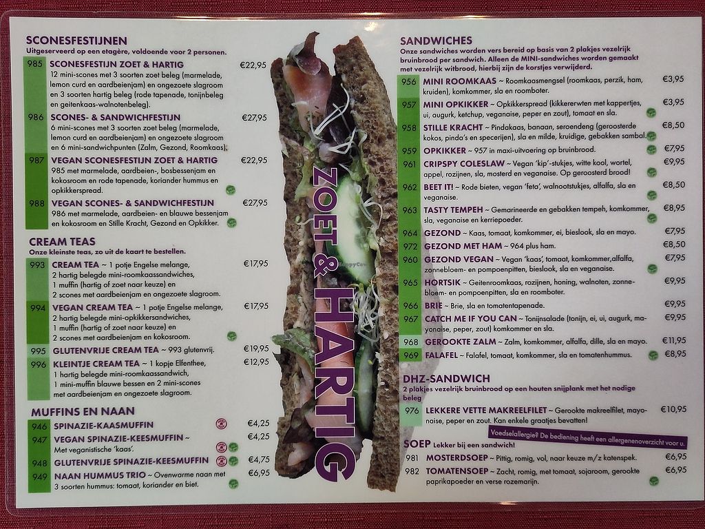 Ten eerste is de locatie prachtig. Ook leuk dat er een winkeltje, tuin en museum bij zit. Het menu bevat veel vegan opties, inclusief de Groningse poffert. Je kunt ook vegan combi's kiezen, zoals de cream tea (thee, scones, muffin, sandwich) of scone/sandwichfestijn. Daarnaast hebben ze een ruim assortiment aan theecocktails, erg bijzonder! Echt een aanrader dus.