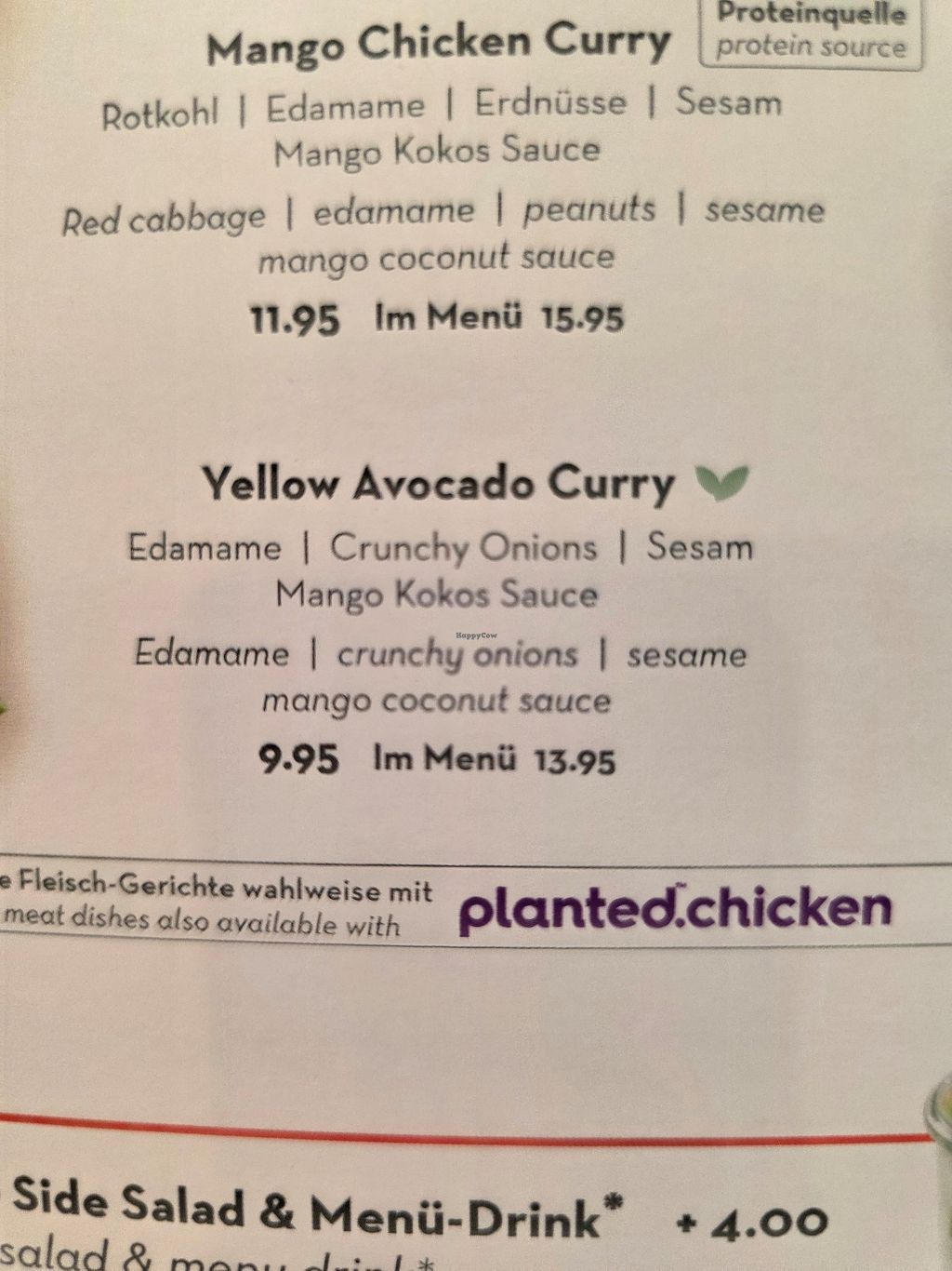 Serves meat, vegan options available. German restaurant franchise with emphasis on simple, healthier food. Vegan items are clearly labelled on the menu and offers dishes with planted.chicken! as well as vegan harvest roast vegetables, various salads, soups, wraps, sandwiches, cold pressed juices, smoothies, and coffee with a plant milk option. Offerings may vary by location. Open Mon-Fri 11:00-21:00, Sat-Sun 12:00-21:00.