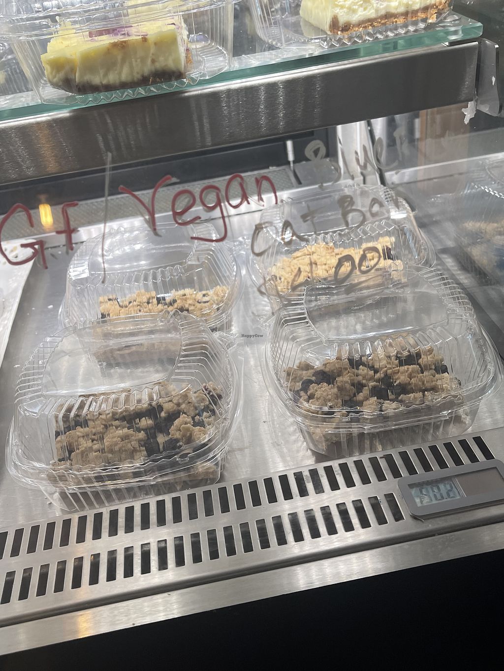 Coffee shop with plant milks for coffee and at least one vegan treat, such as a blueberry oat bar. Coffee is sustainably sourced. Open Mon-Sun 8:00am-4:00pm.